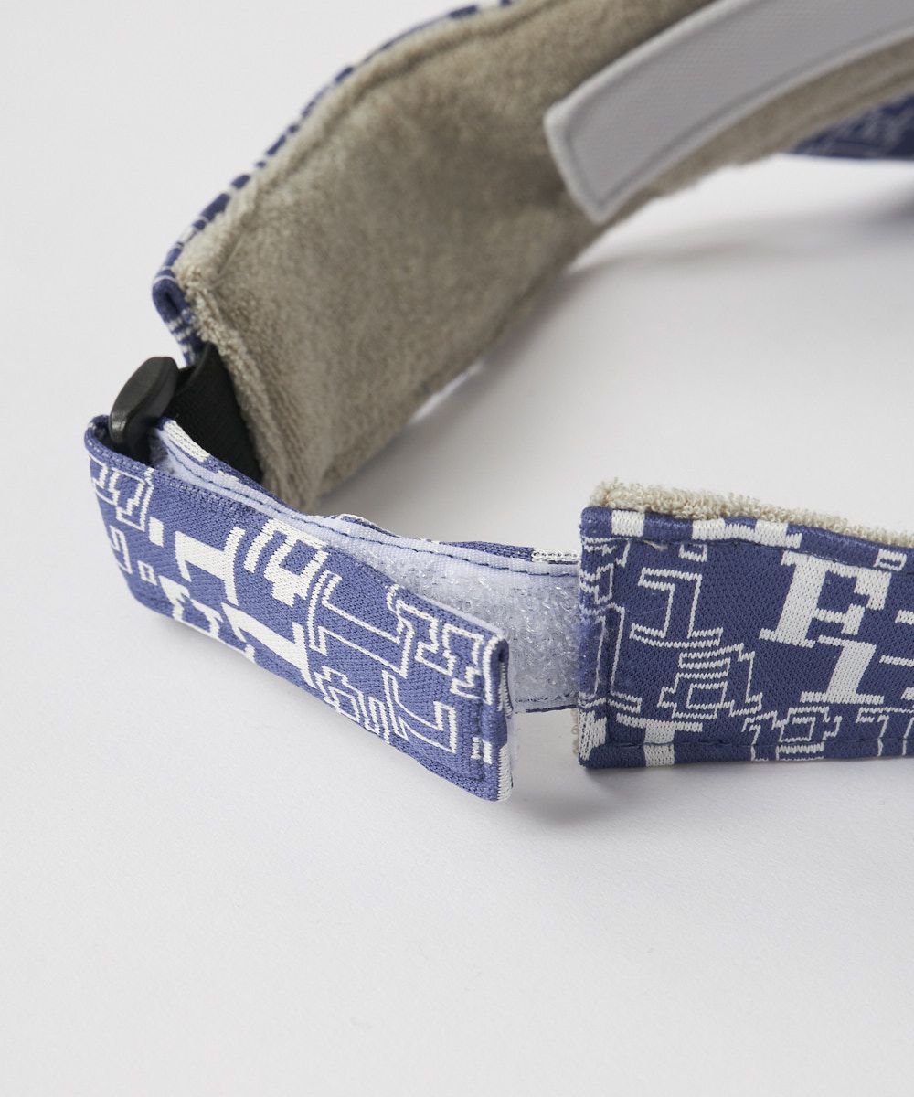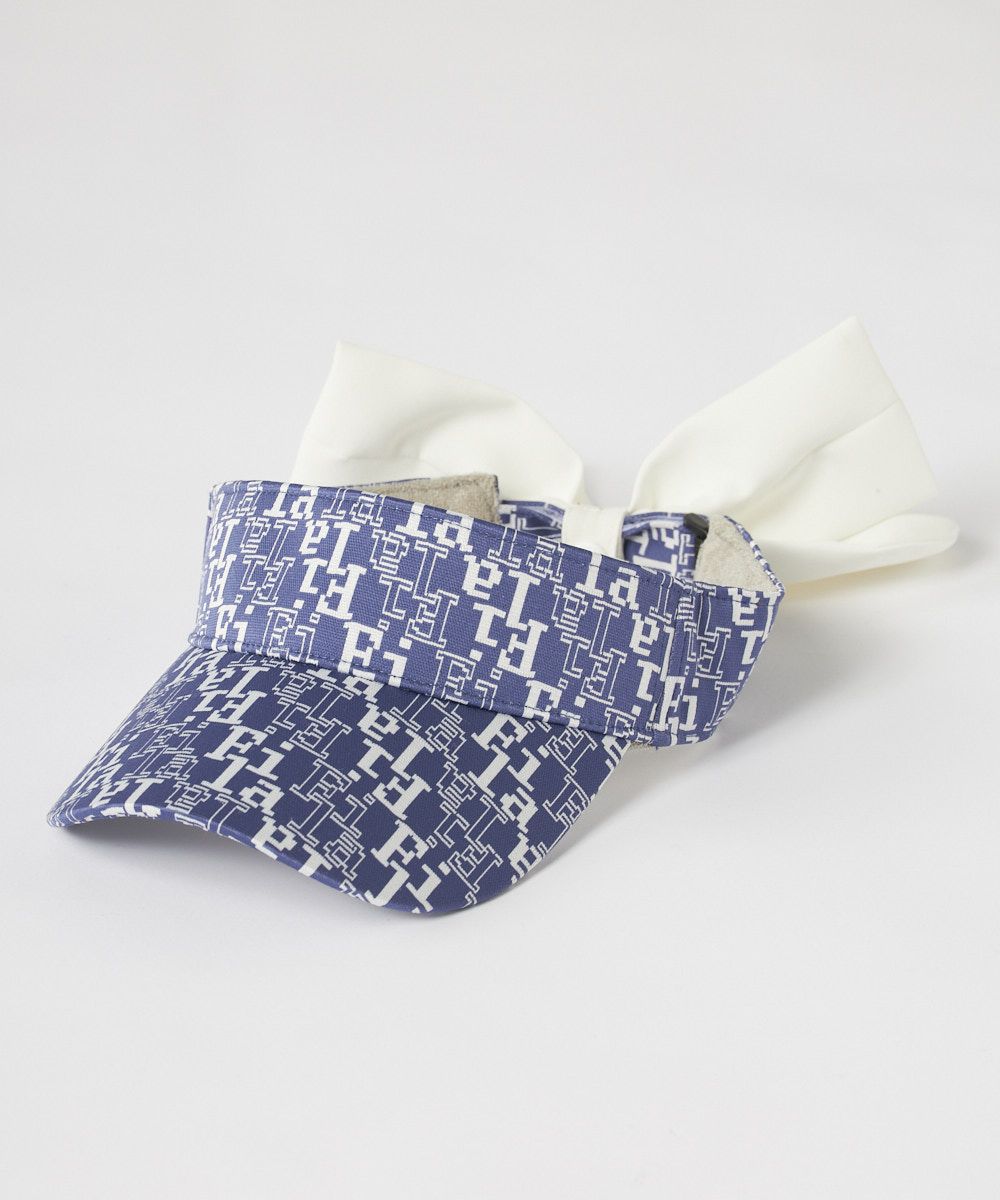 デジタルフォントのタイポ柄がおしゃれなサンバイザー。ボタンで取り外せるジョーゼット素材のリボンがアクセント。