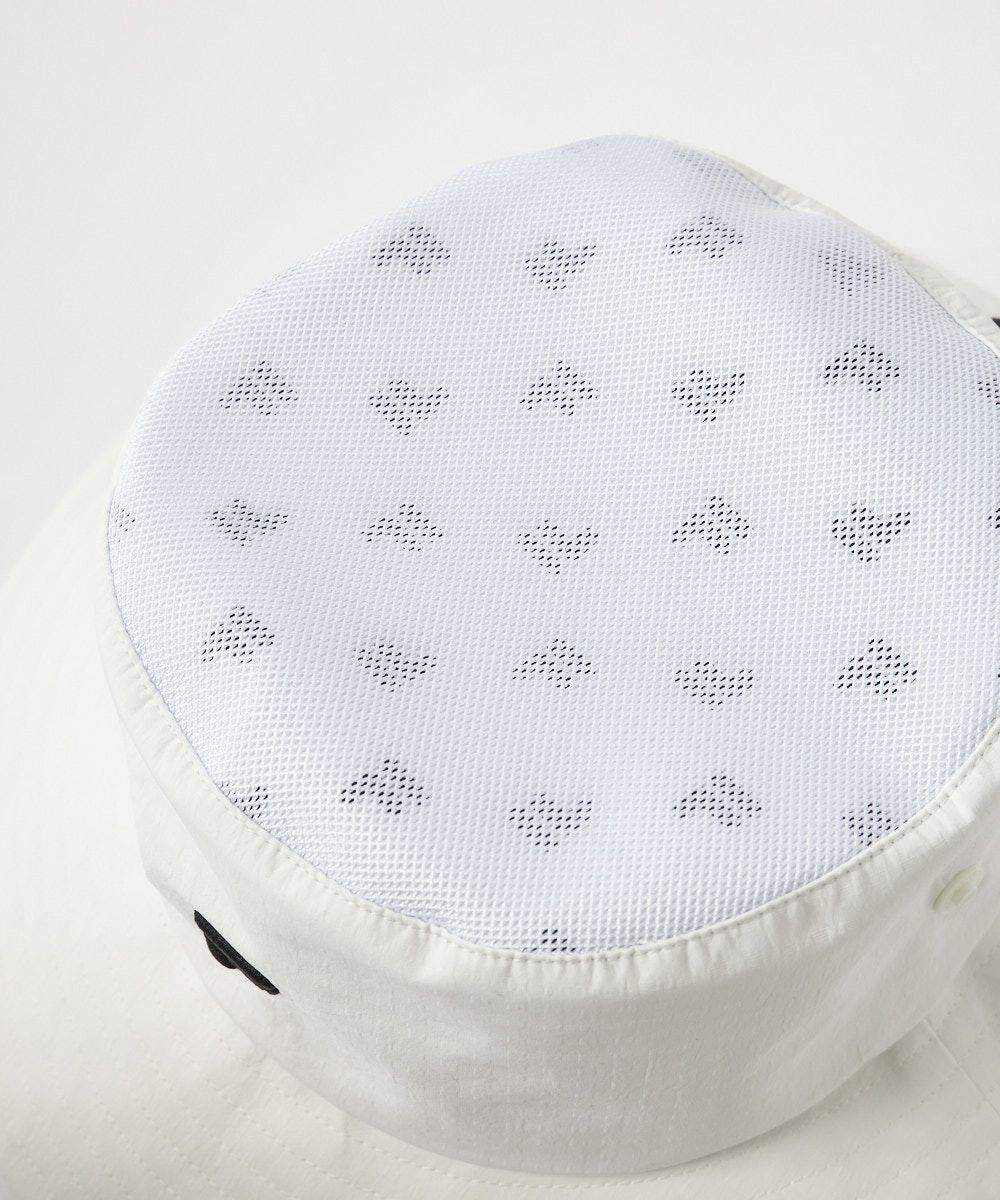 体感-15℃の遮熱性に優れたアルミ蒸着生地を裏地に使用した、熱中症対策のハット。暴対部分には通気性をもたらすメッシュパネルを配備。