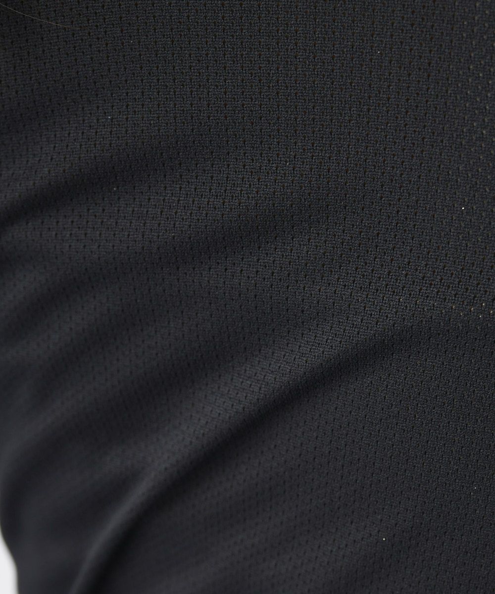 接触冷感の機能糸を使用したベア天竺に、飛び柄をグリッタープリントで施したインナーシャツ。袖下、背中 のメッシュ素材は、皮膚接着面積が少ない為汗をかいてもべとつかず、蒸れを軽減。