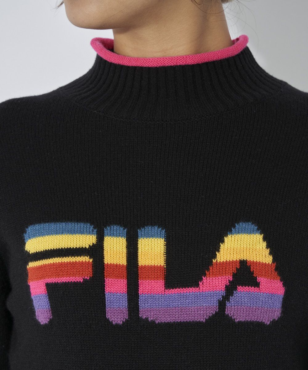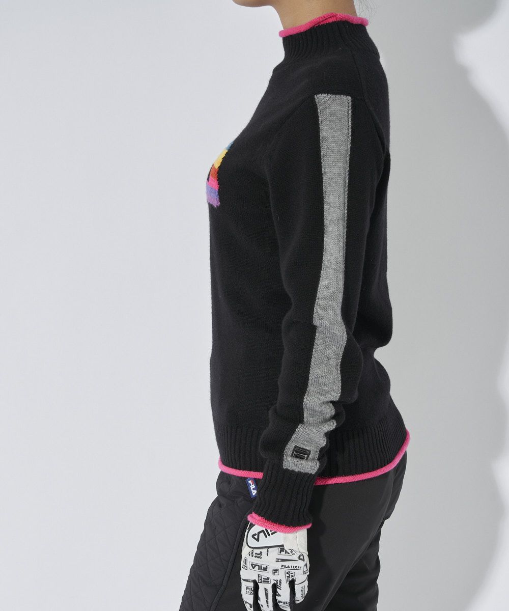 レインボーをイメージしたカラフルな配色が楽しいモックネックセーター。 衿端や袖口、裾口がクルリとカ ールした仕様が可愛いアクセントになっています。