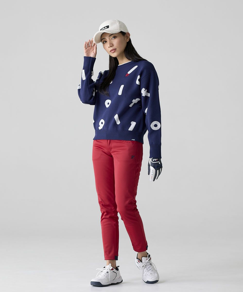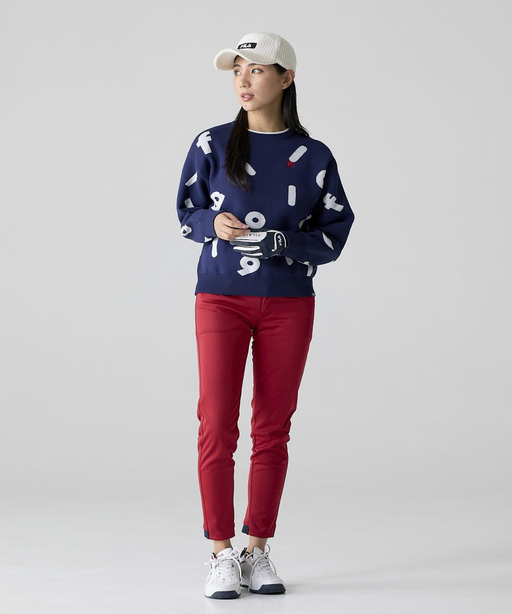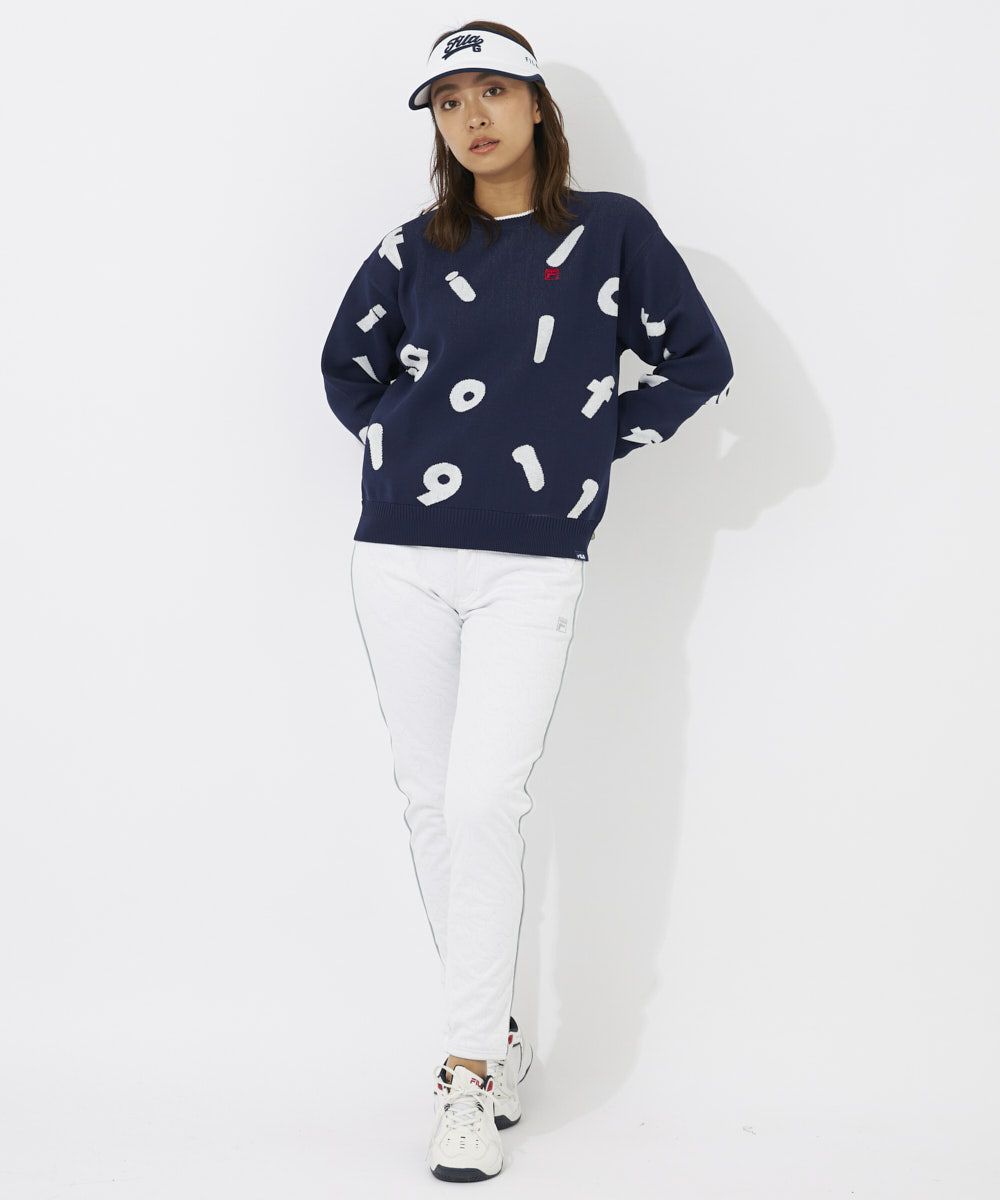 レディース ロゴ柄クルーネックセーター/軽量ポリエステルニット