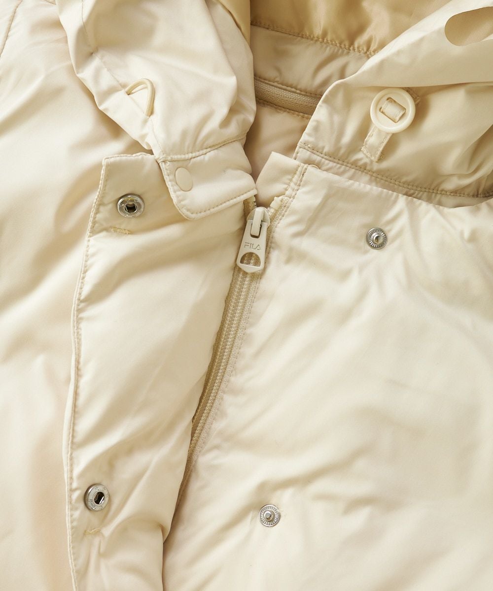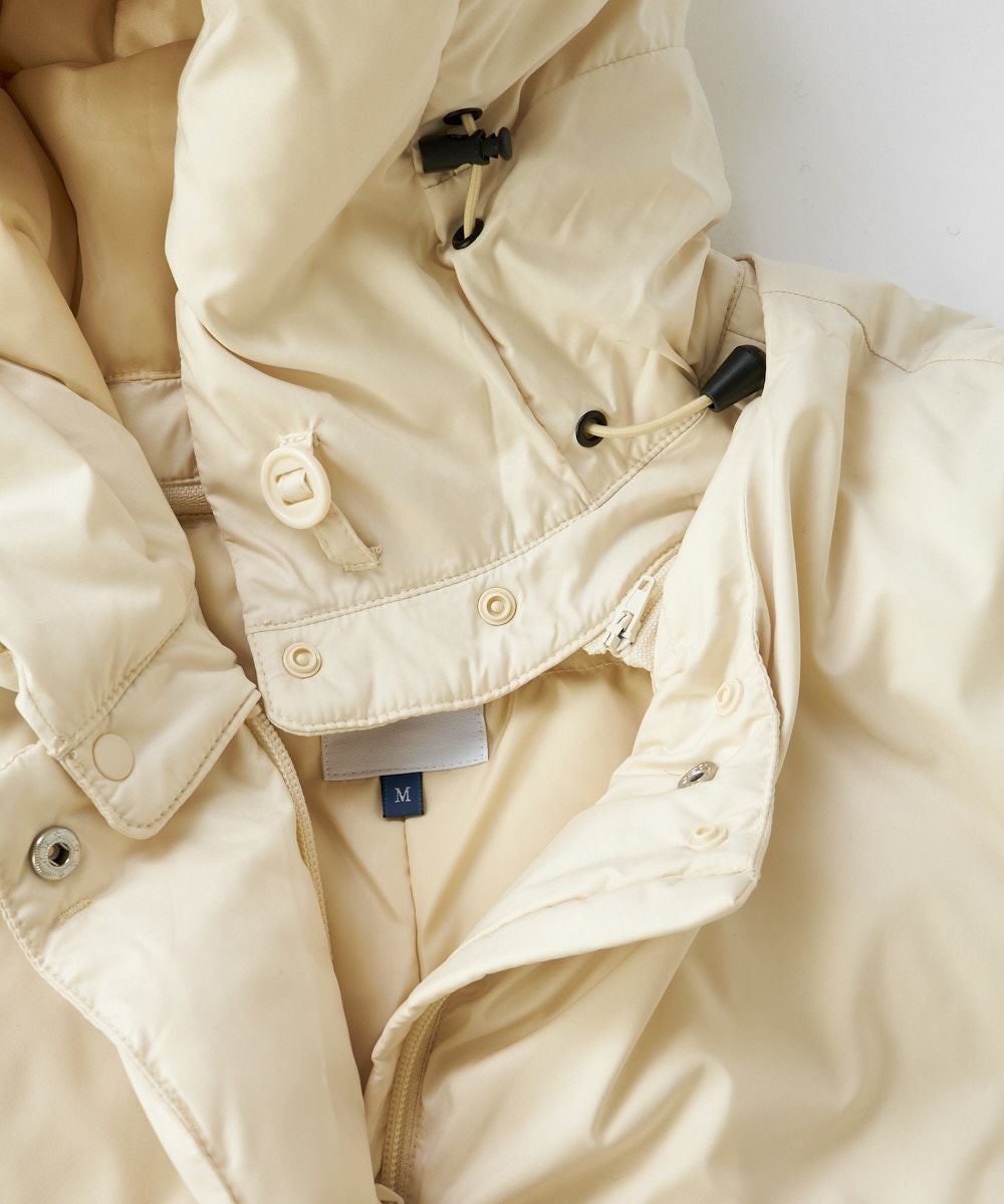 フード取り外し可能なミドル丈のダウンブルゾン。