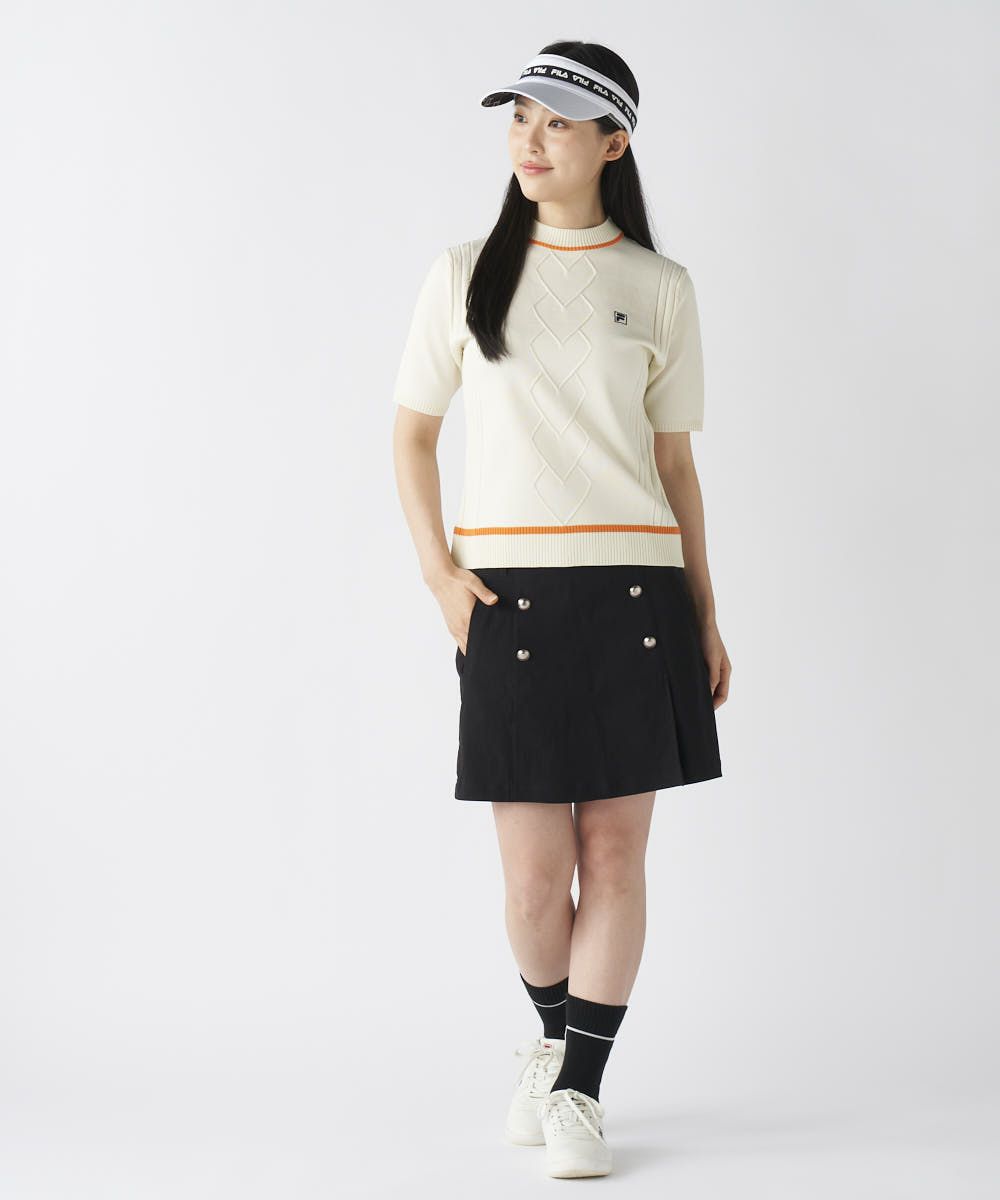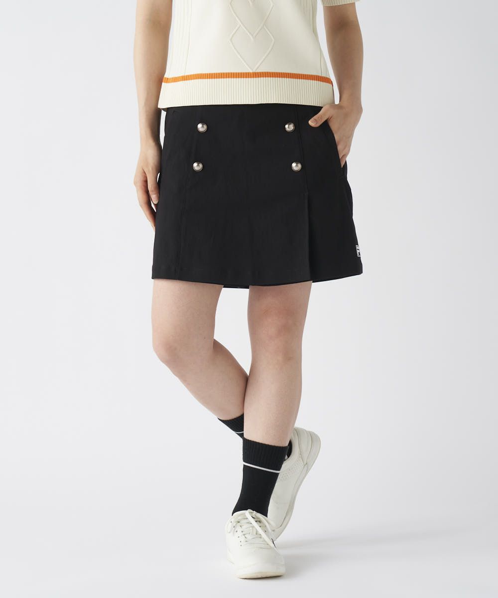 スカートのようなフェミニンな見た目でありながら、ショートパンツの動きやすさを兼ね備えたキュロットタイプ。高めのウエストデザインとすっきりとしたAラインシルエットが、脚長・スタイルアップ効果を発揮します。メタルボタンが上品なアクセントとなり、大人の女性のアクティブスタイルに華やかさを添えます。