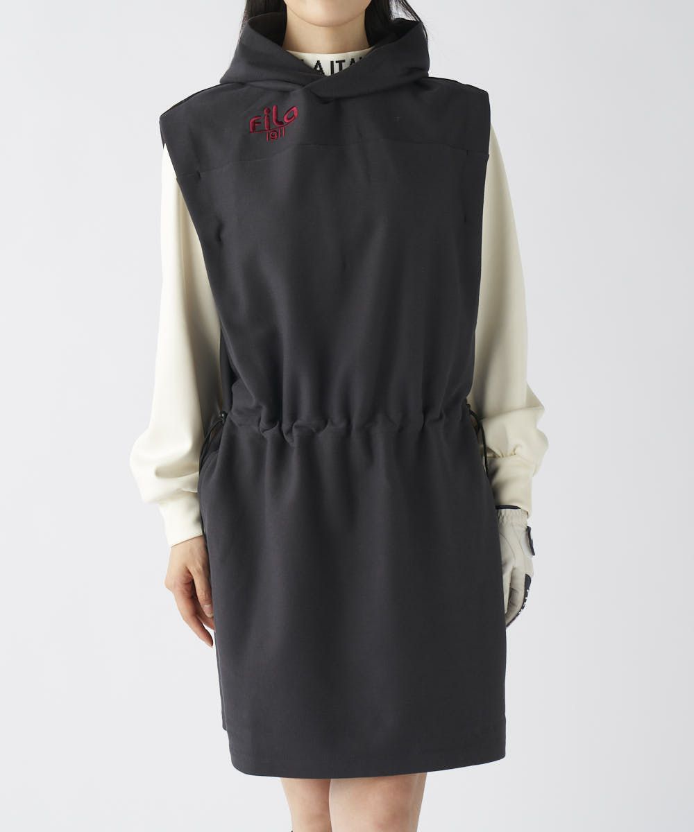 フーディーベストタイプのワンピースで、トレンド感とスポーティさを両立。程よく身体から離れるゆったりシルエットは、スイングしやすく、スタイルアップ効果も演出します。ウエストには調整コードが付いており、好みに合わせてブラウジングすることで、さらに着こなしの変化が楽しめます。