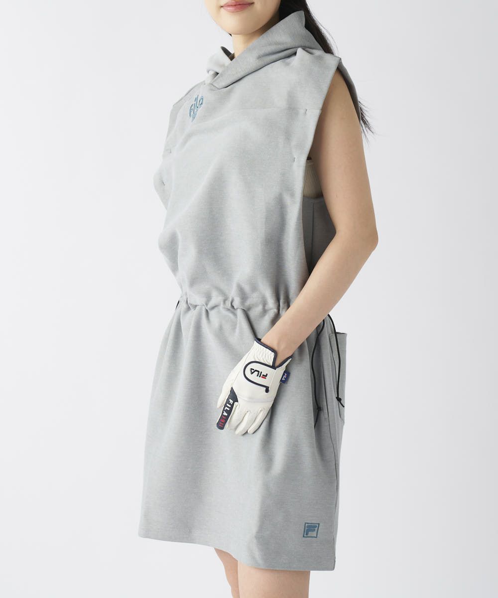 フーディーベストタイプのワンピースで、トレンド感とスポーティさを両立。程よく身体から離れるゆったりシルエットは、スイングしやすく、スタイルアップ効果も演出します。ウエストには調整コードが付いており、好みに合わせてブラウジングすることで、さらに着こなしの変化が楽しめます。