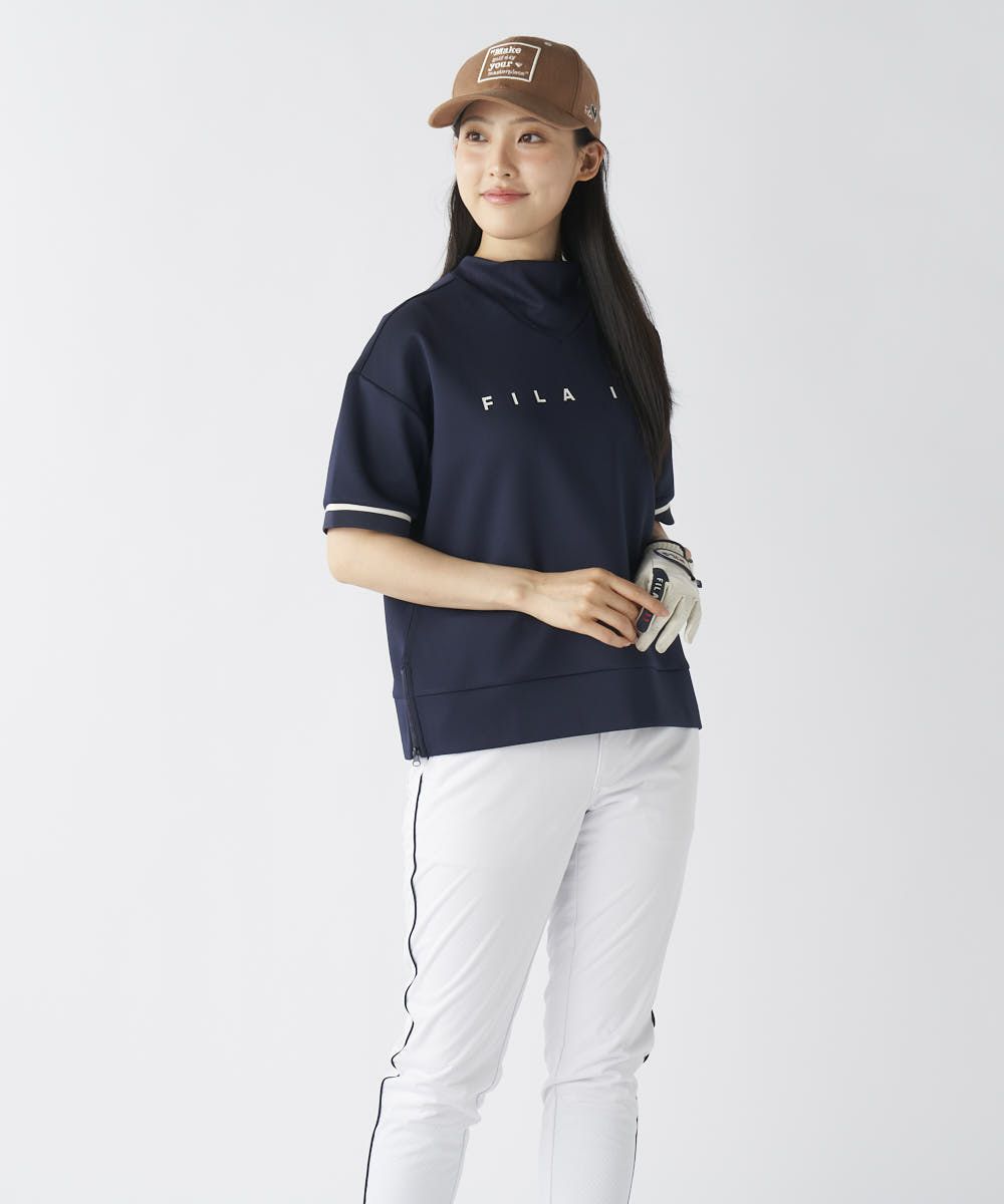 凹凸感のある表情豊かなトップとして、一枚で着用してもシンプルになりすぎないのが魅力です。ゆったりとしたシルエットで、スイングしやすく、アクティブな動きに対応します。