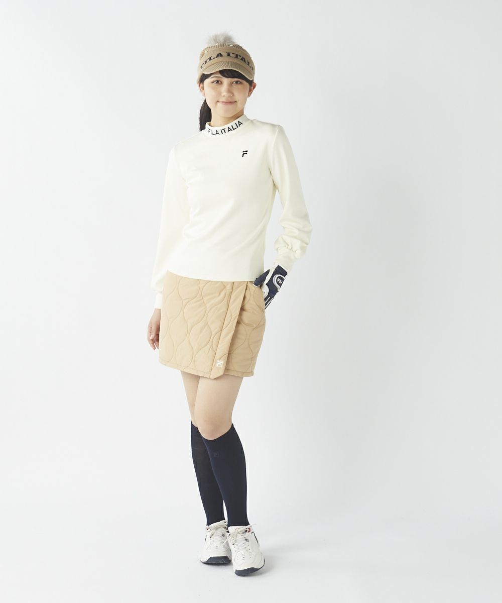 防風性と保温性に優れた中綿キルトのラップスカートです。表地、中わた、裏地すべてにポリエステル100%を使用し、特に裏地はフリース素材で、高い保温性を発揮します。