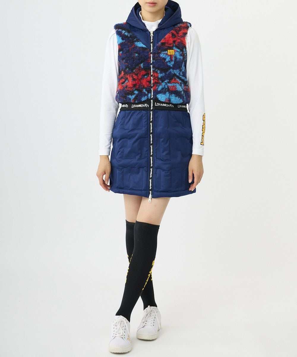 上身頃はオリジナル柄のストレッチボアフリース素材、下身頃は圧着加工裏地蓄熱フィルム中綿のLMロゴキルト素材の異素材デザインワンピースです。