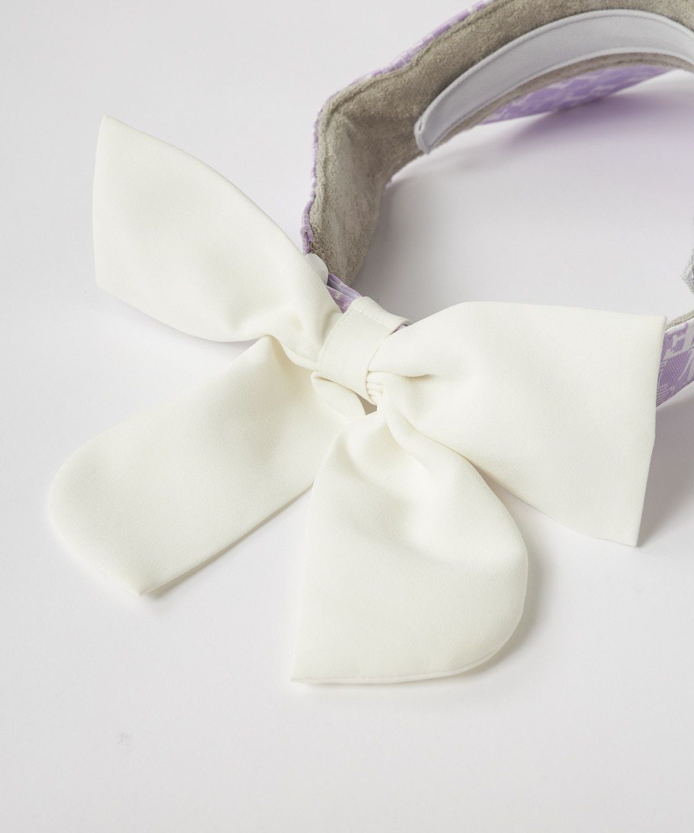 デジタルフォントのタイポ柄がおしゃれなサンバイザー。ボタンで取り外せるジョーゼット素材のリボンがアクセント。