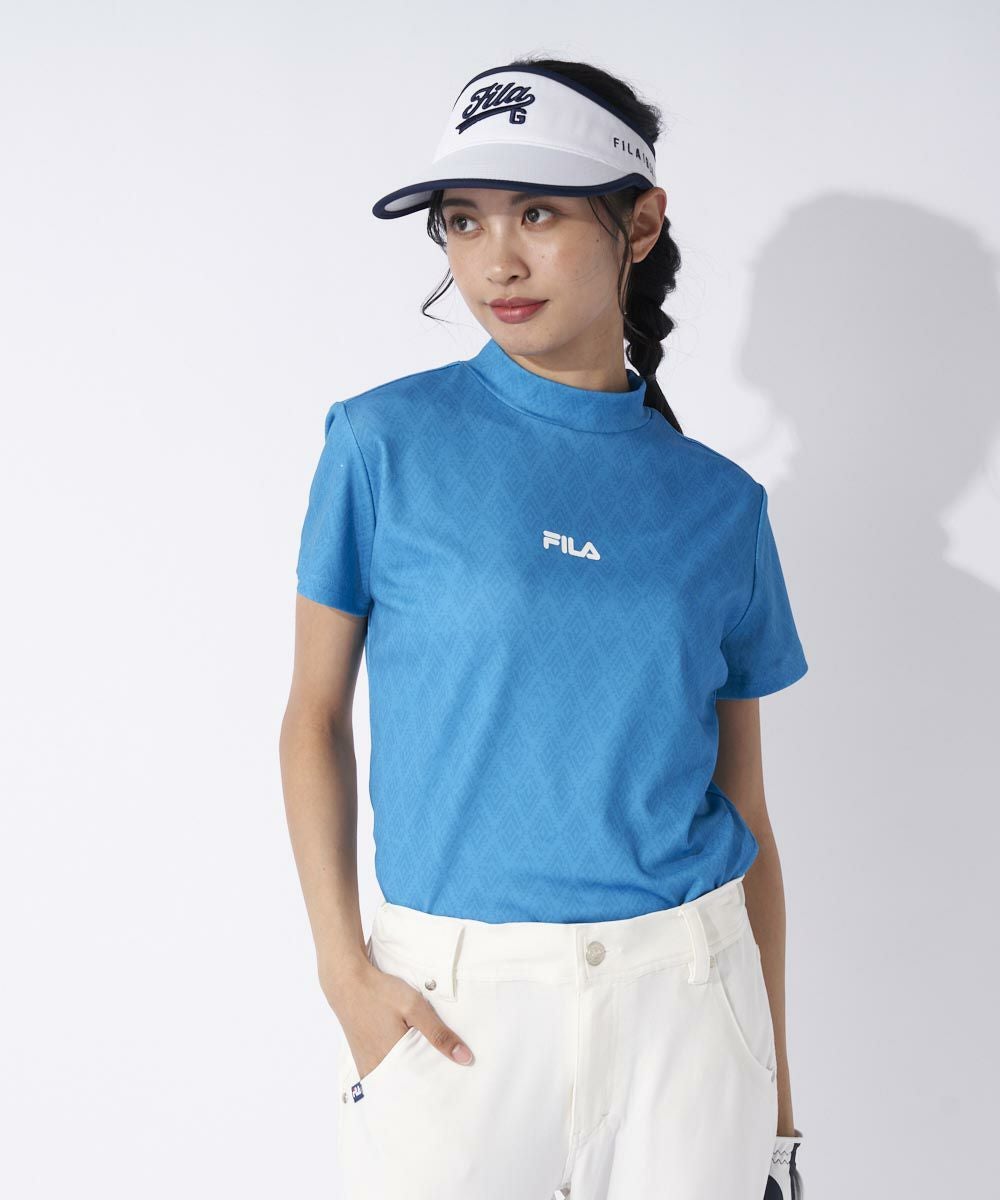 同系色の総柄プリントに胸元のロゴがアクセントのモックネックシャツ。UVカット/吸水速乾機能付きでプレー中も快適。接触冷感機能は暑い時期にも嬉しい1枚です。