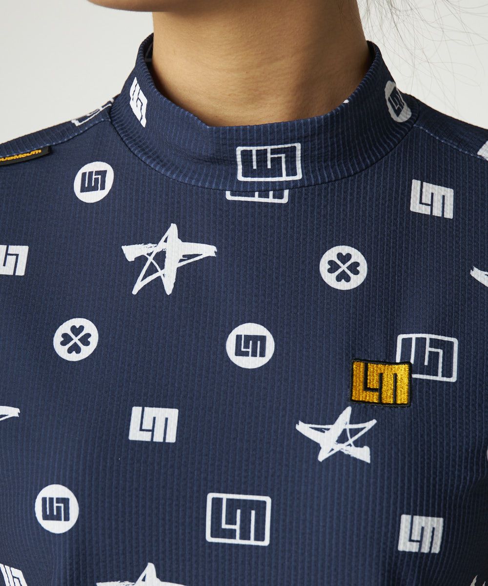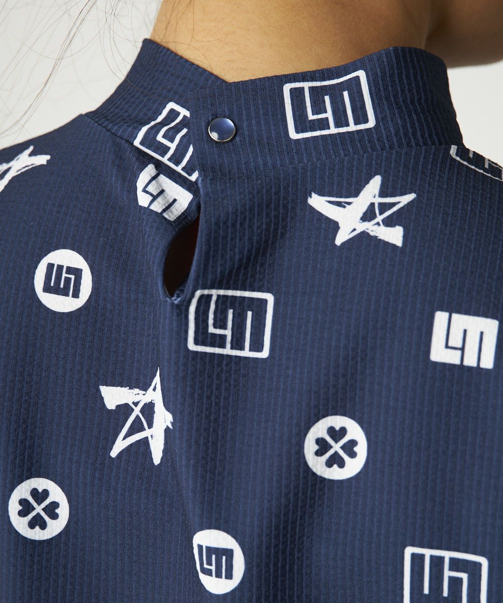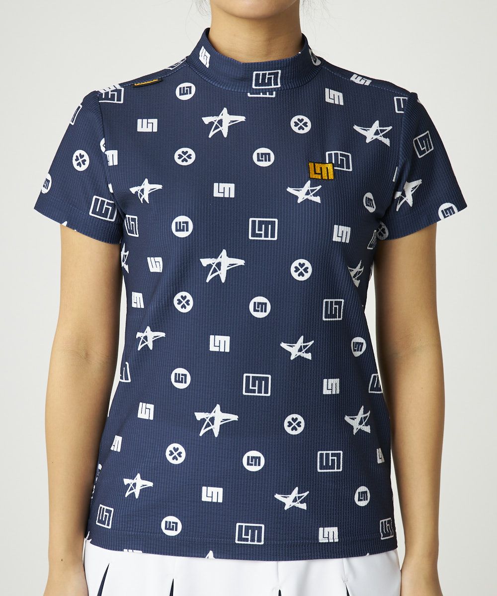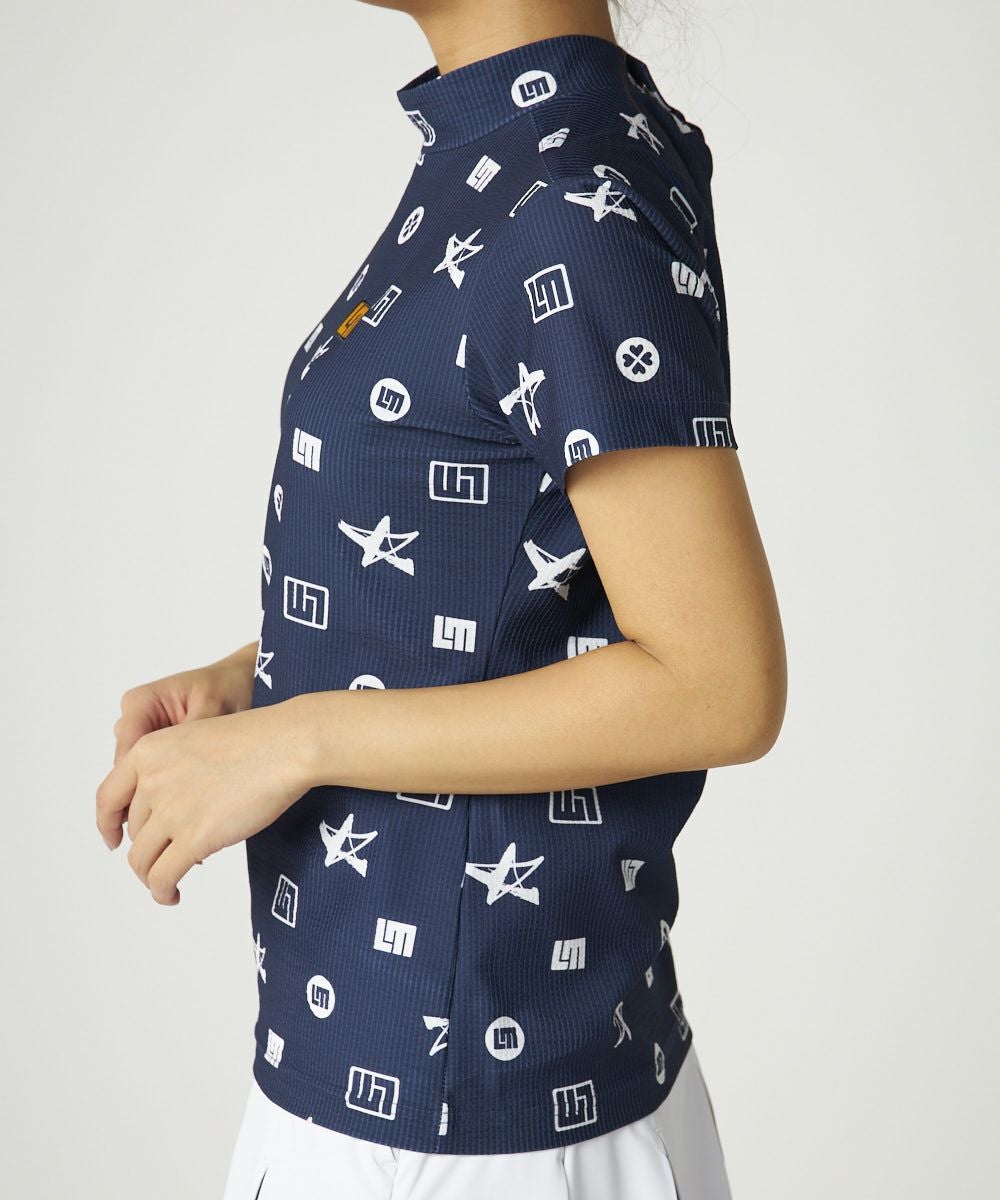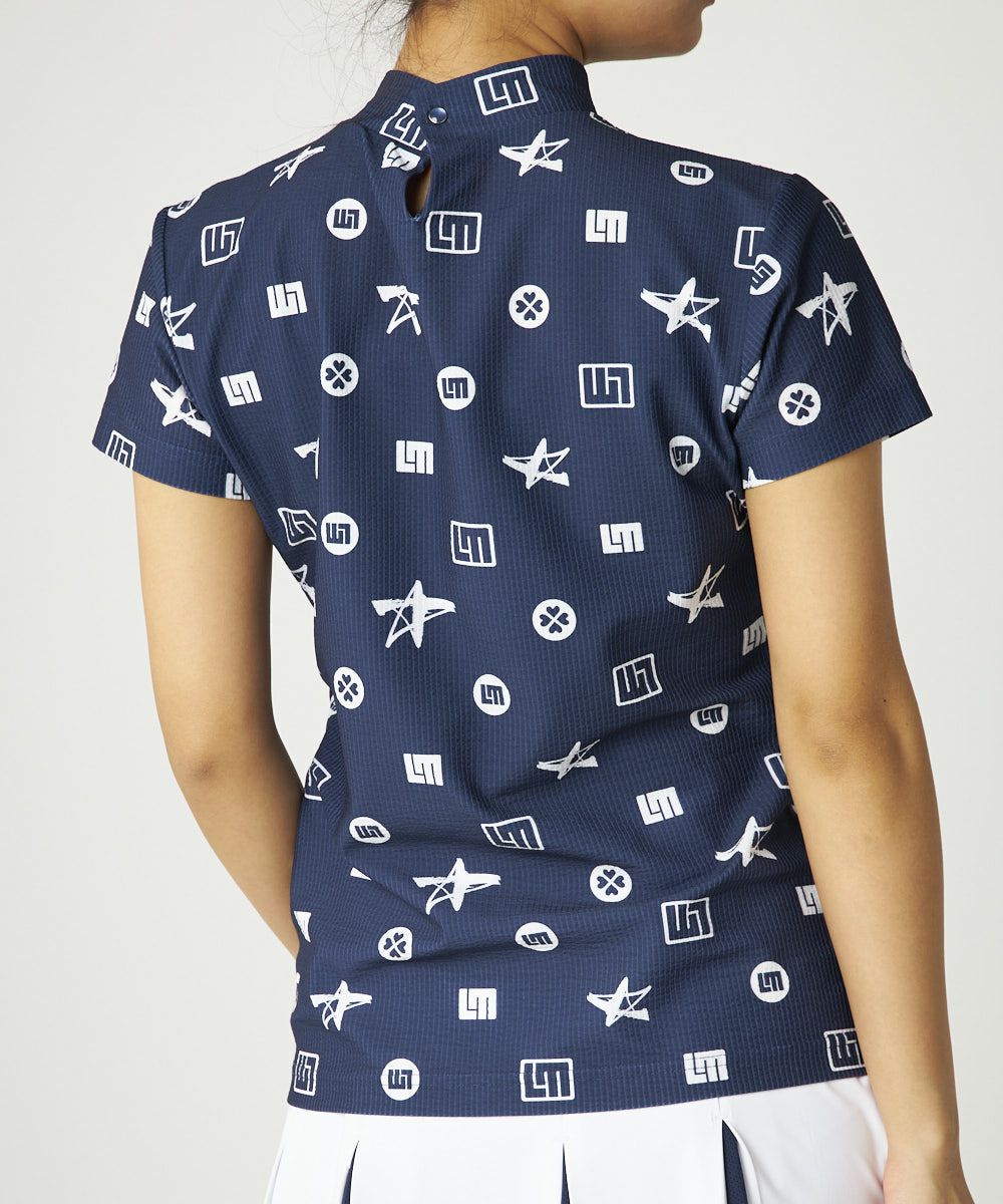 レディース ストレッチサッカー 柄モックネック半袖シャツ ネイビー
