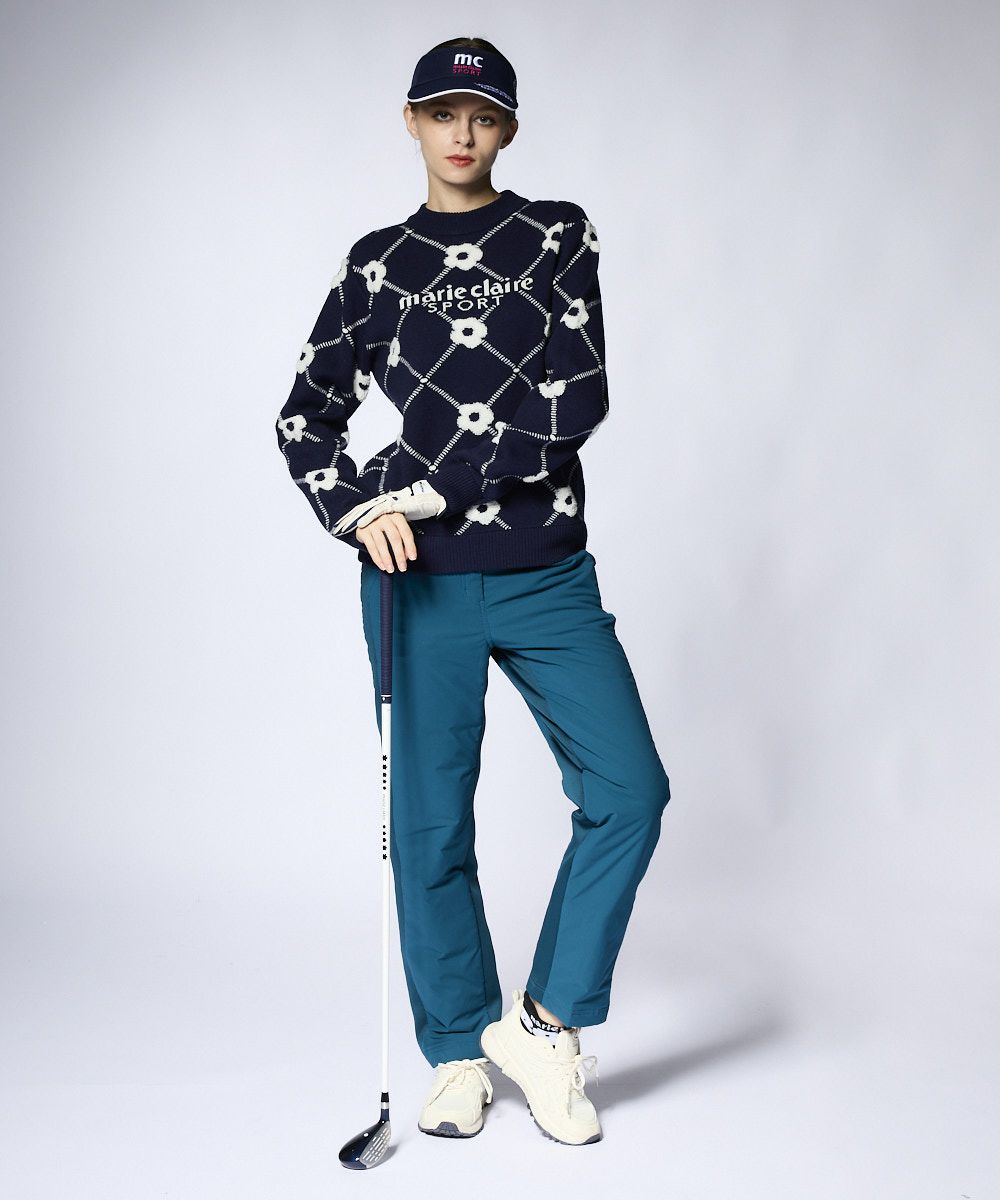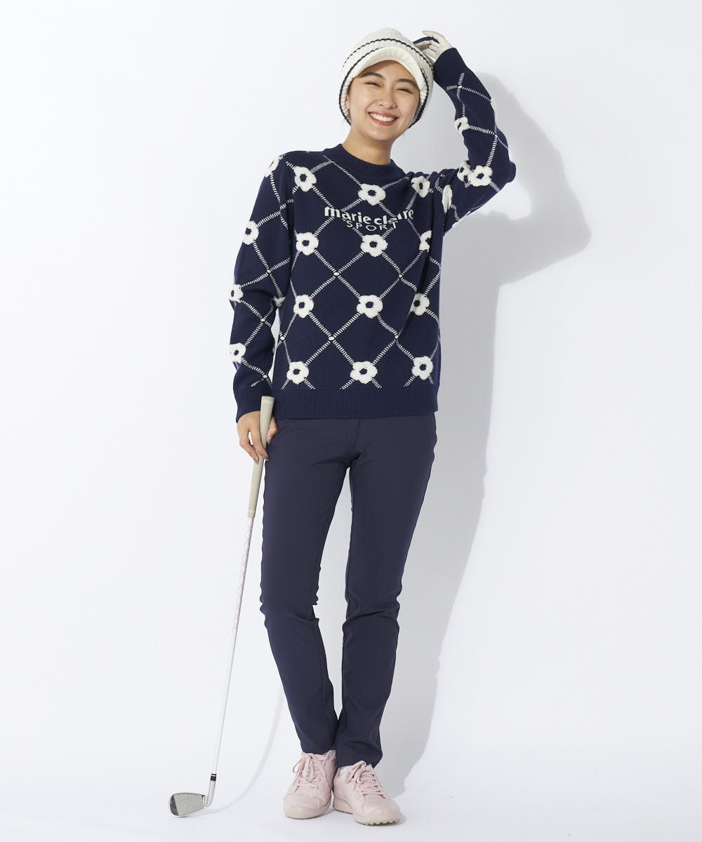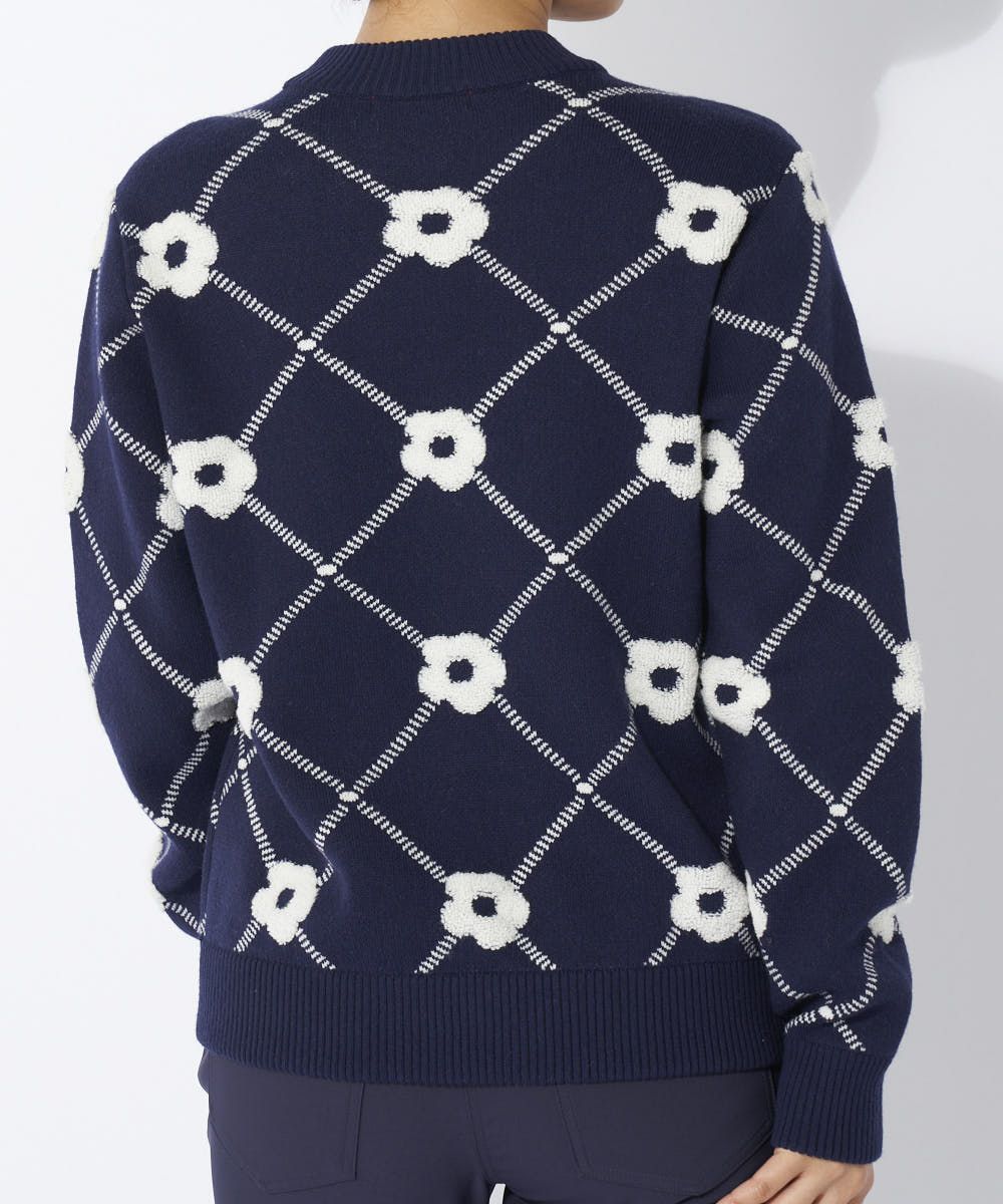 パイル編みのお花柄が可愛いクルーセーター♪軽くて膨らみ感のあるストレッチニットの大きめシルエット。鮮やかなトレンドカラーがゴルフシーンを演出します。