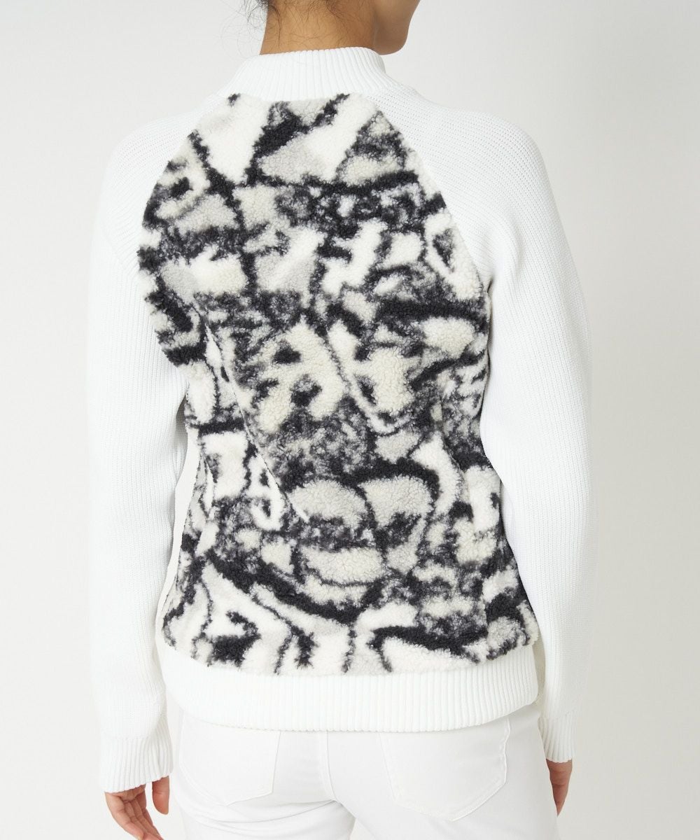 前後身頃はオリジナル柄のストレッチボアフリース素材を使用し、袖はニットの異素材デザインプルオーバーです。 身頃は暖かく、袖はニットで動きやすく、一枚でしっかり防寒できるアイテムです。