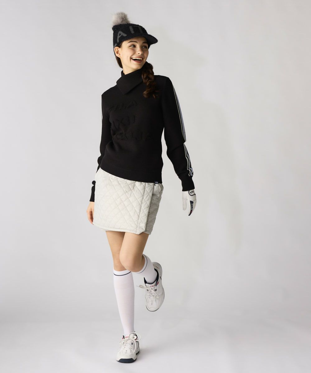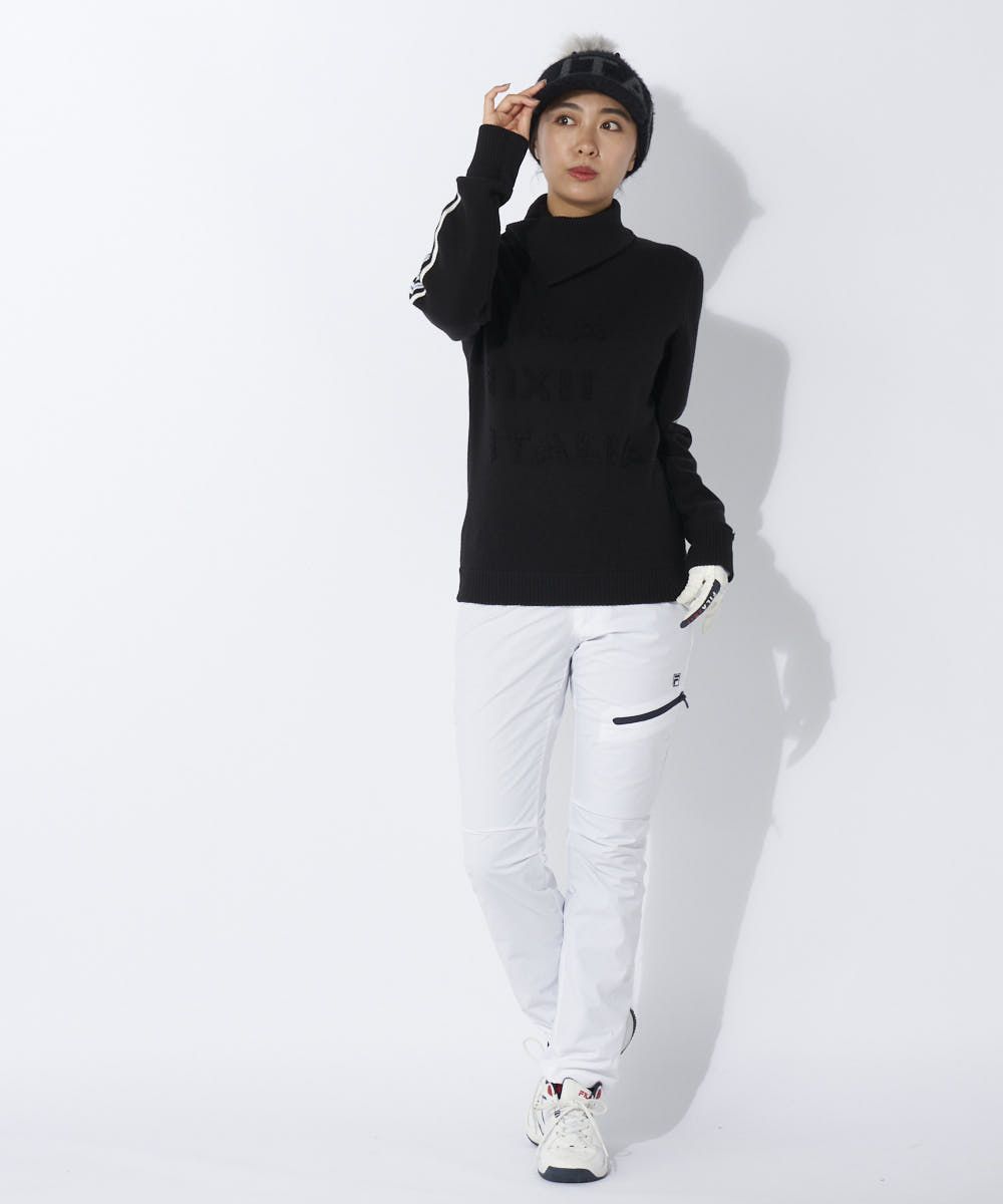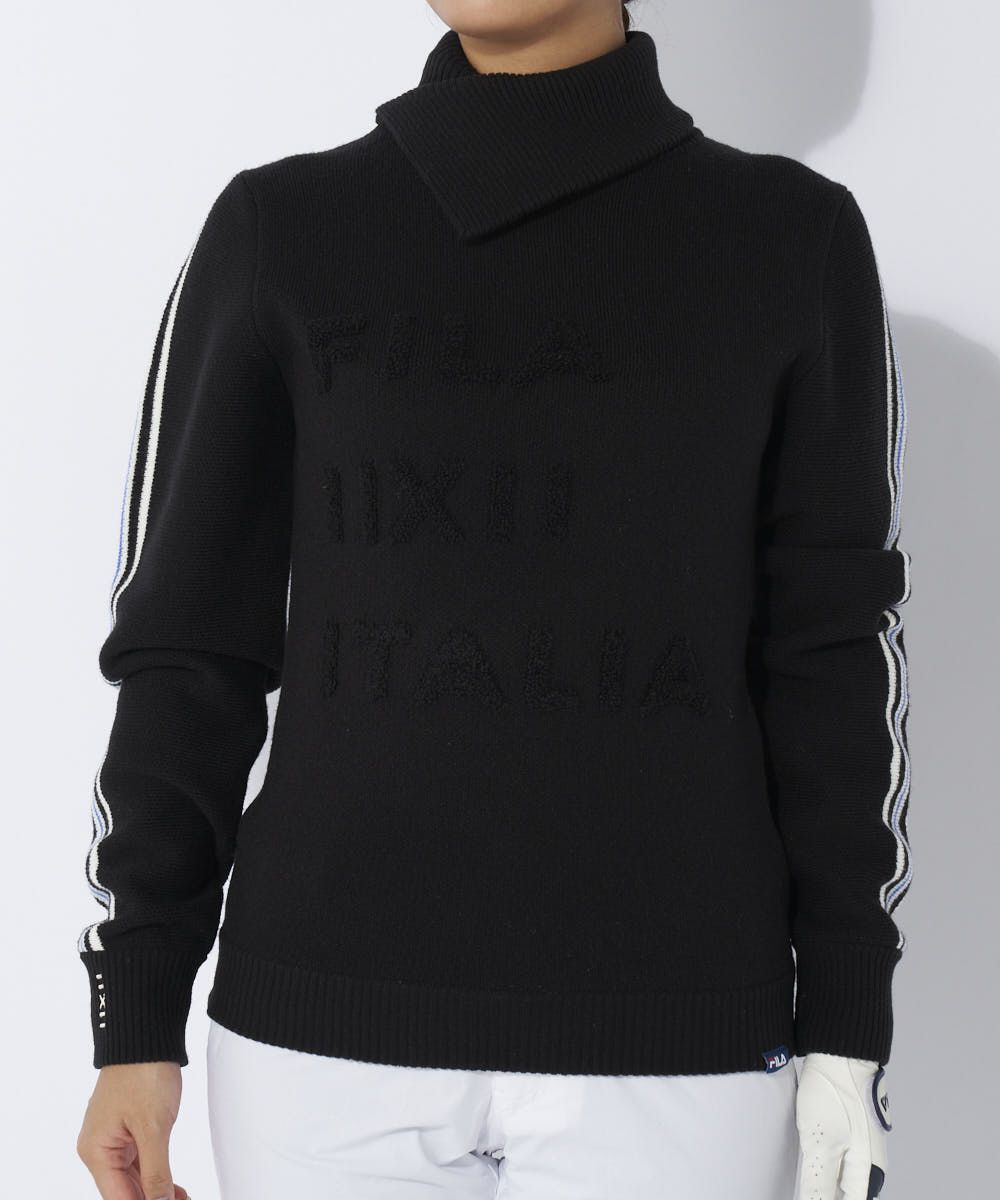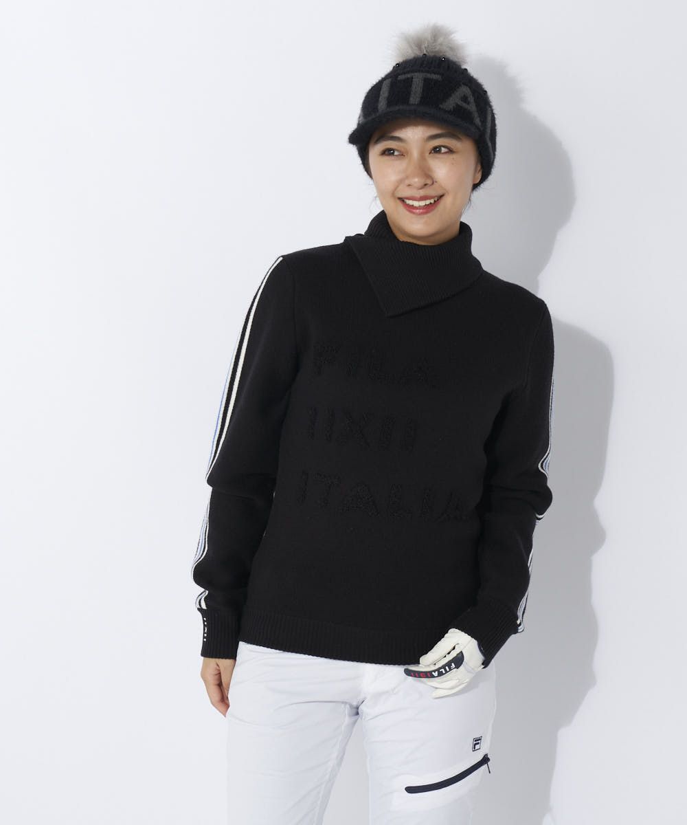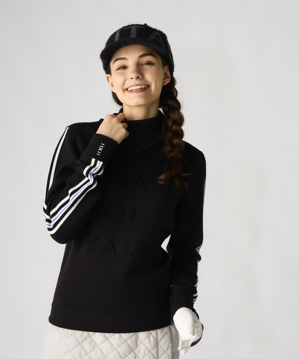 変形ショールカラーが特徴的なセーター。立体感のあるパイルジャガードでグラフィックを表現。