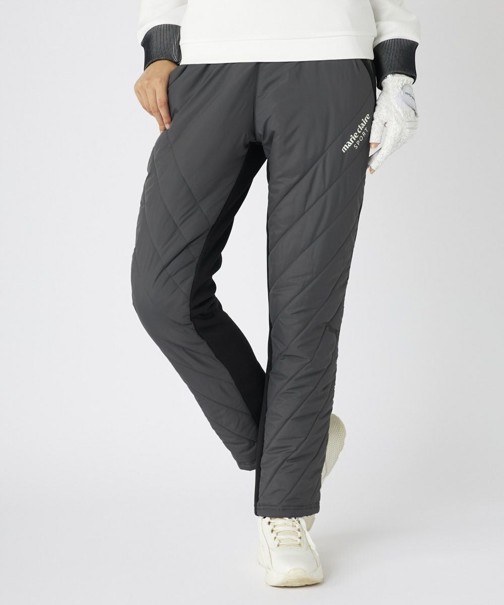 素材の切り替えがオシャレな中綿パンツ。左もも部分にはステッチと合わせて斜めにロゴを入れ、ポイントにしました。