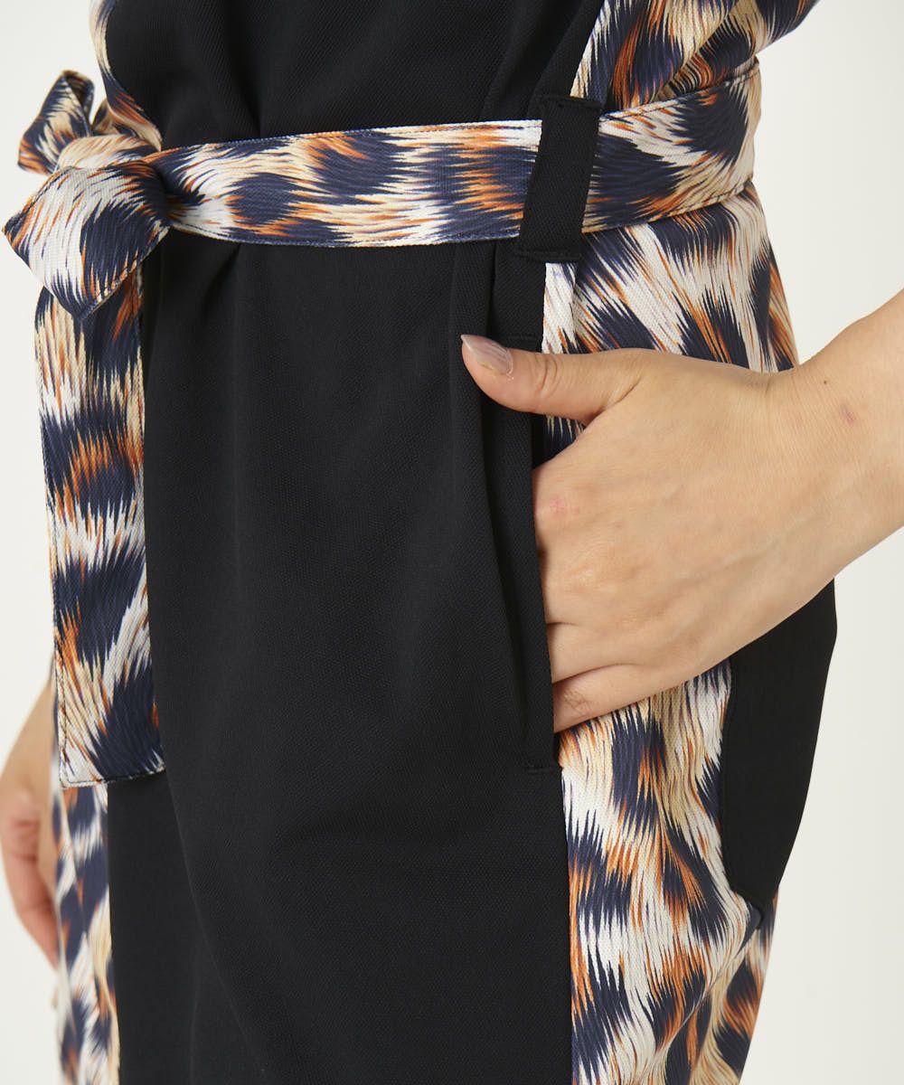 サラッとした肌触りの ポリエステル素材を使用した柄ワンピース。たて切替柄の2ブロックワンピース。今シーズンのインパクトのある柄を展開。