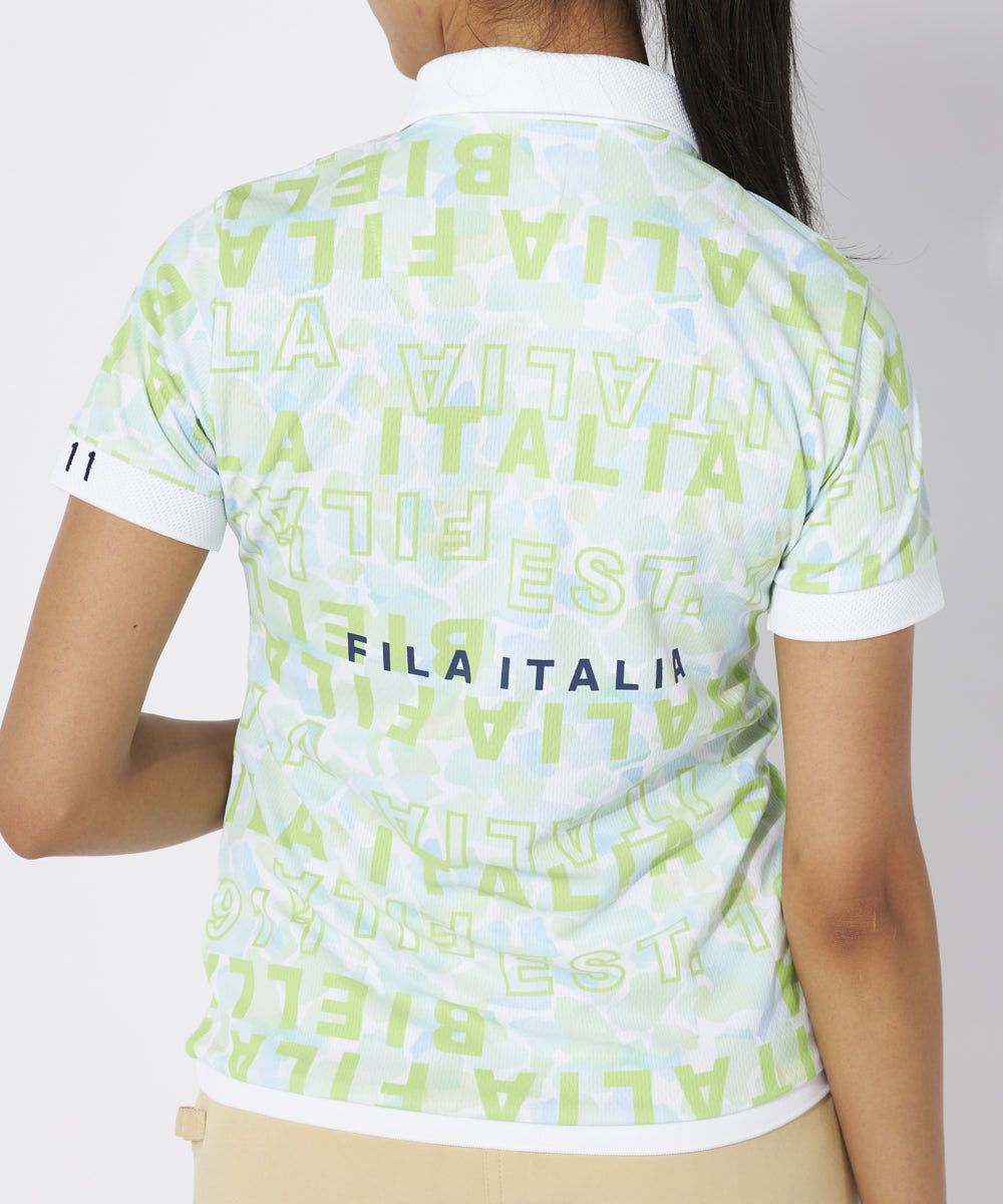 春らしい色合いのモザイクにタイポ柄を重ねたプリント柄のシャツ。裾口リブ仕様のオーバーブラウスタイプ。吸汗速乾、UV、遮熱や接触冷感など、機能たっぷり素材を使用。