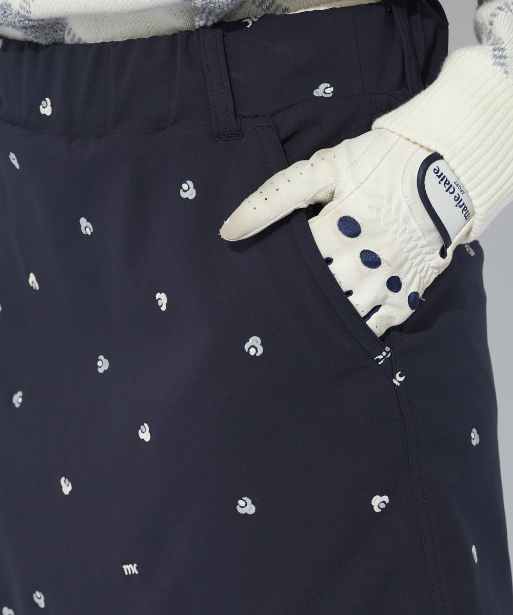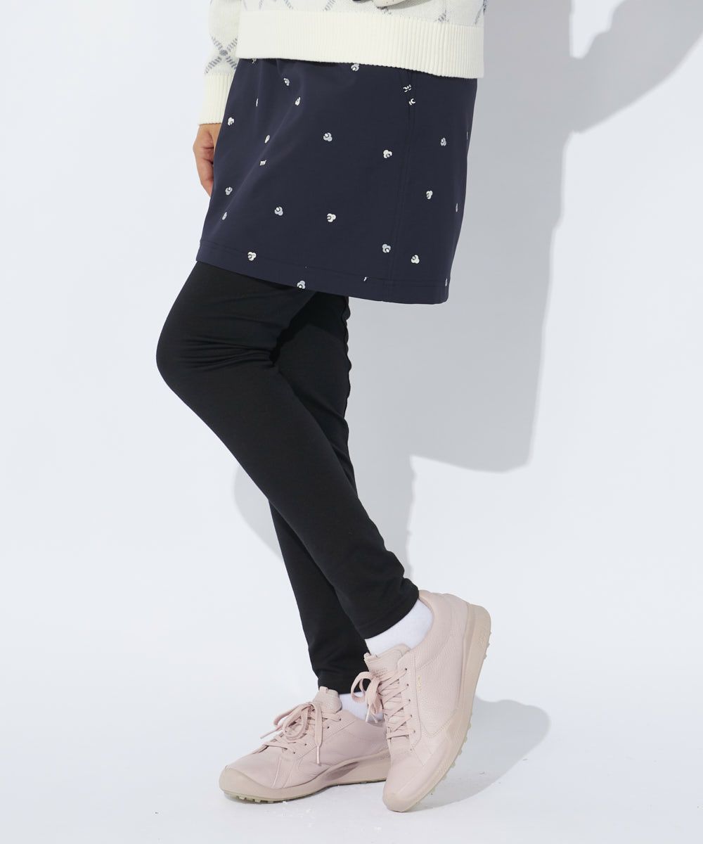 上品な総柄刺繍のパンツはグリーン上で映えること間違いなし。レギンスと一体になっているので着脱も簡単!程よい厚みとストレッチ性で夏の終わりから晩秋にかけてロングシーズン着ていただけます◎