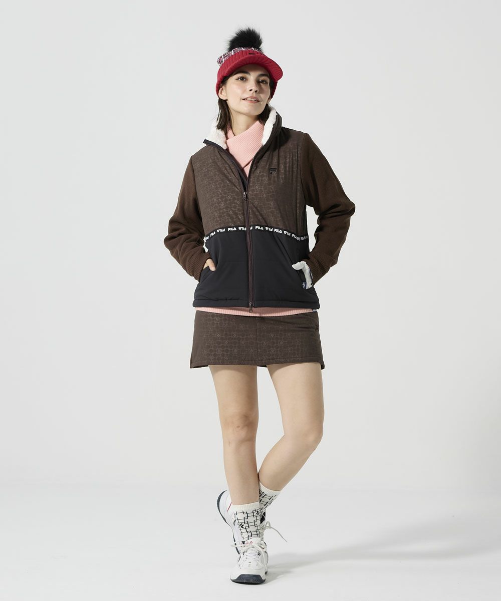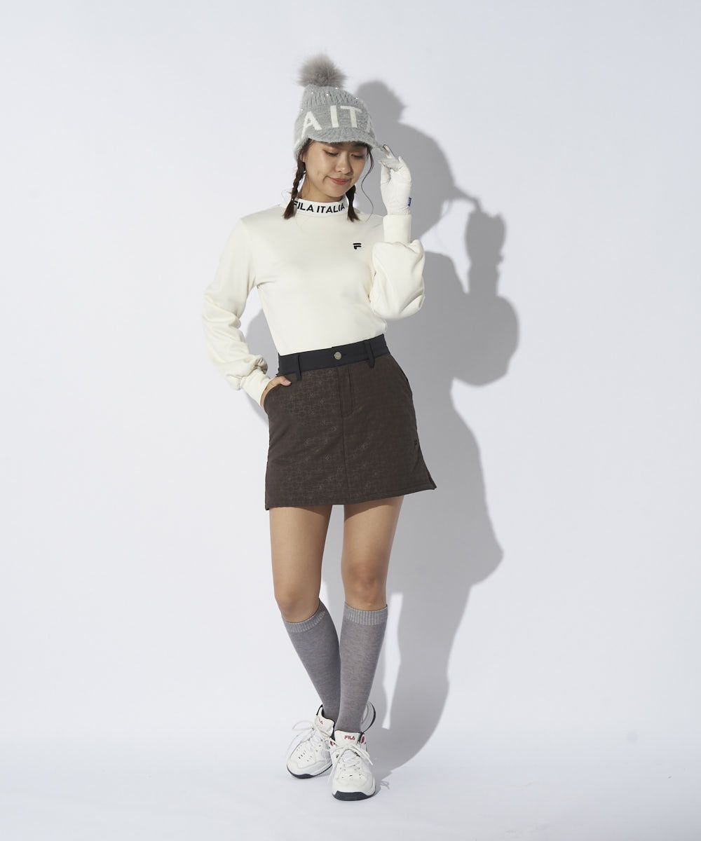 細かいロゴ柄に、ロゴテープでアクセントをつけた異素材ミックスの中綿スカート。