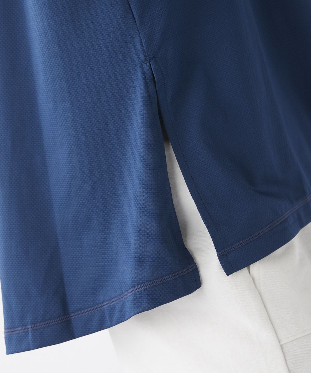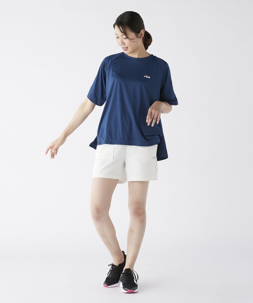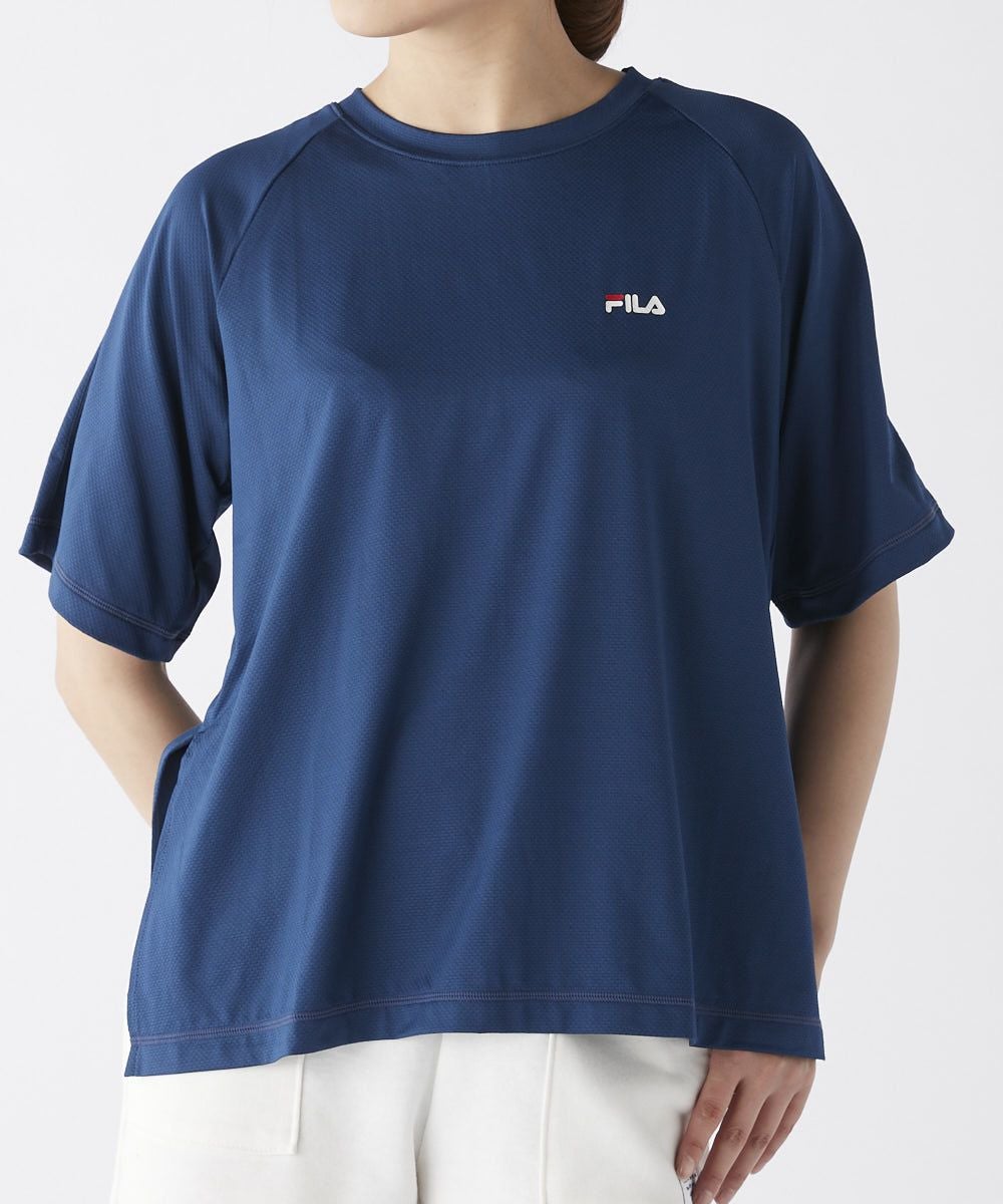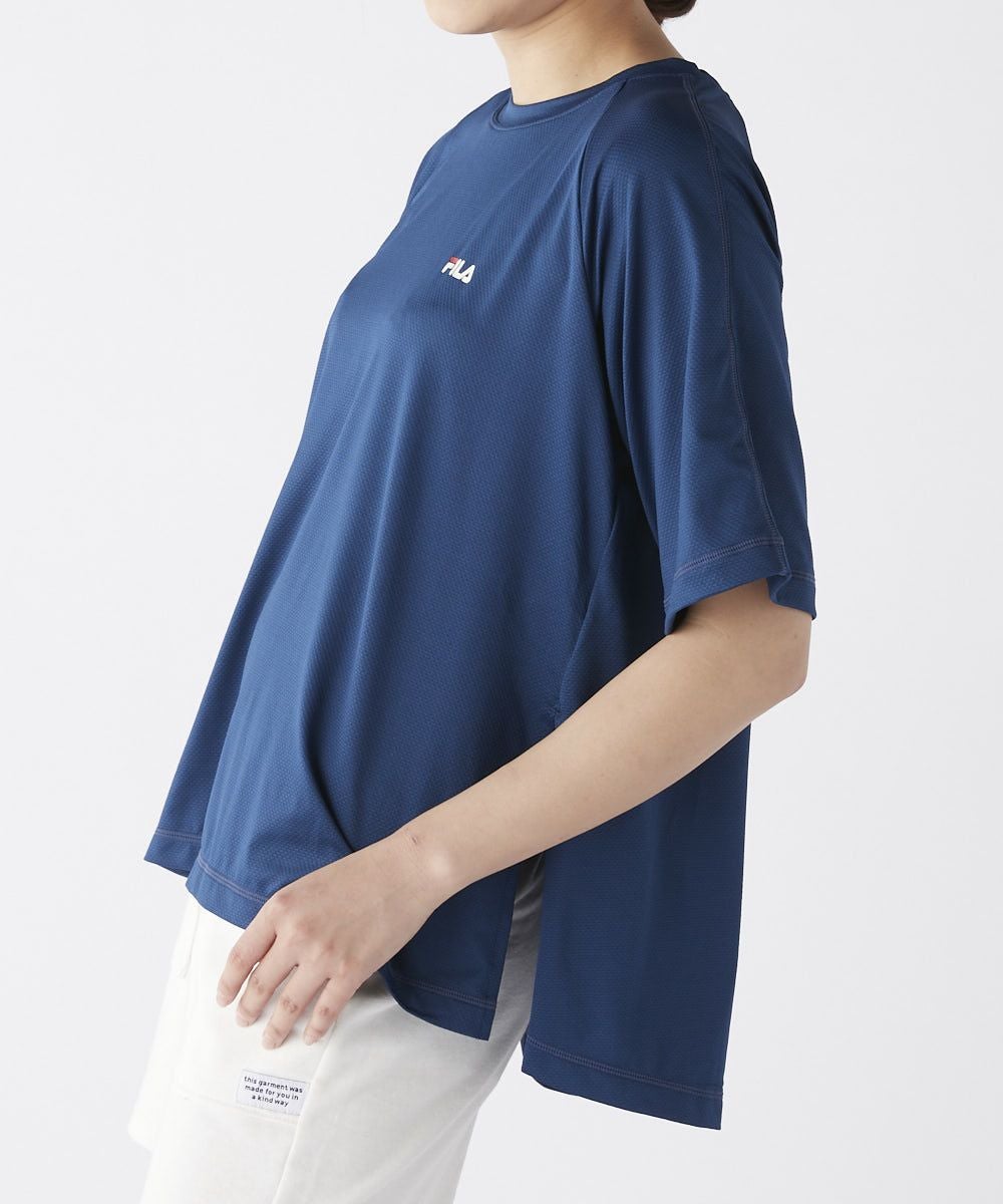 水陸両用で使用できるストレッチ性のあるTシャツ。袖は5部丈、裾は前後差のついたAラインの形です。脇にスリットいり。スポーツはもちろんデイリーウェアに。トリコカラーのFILAロゴプリント入り。