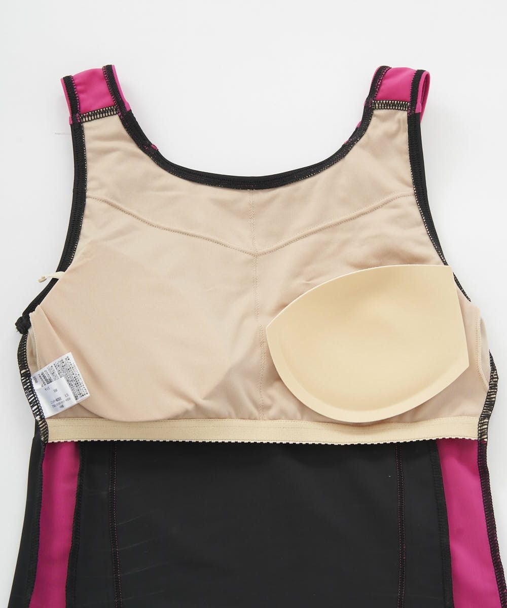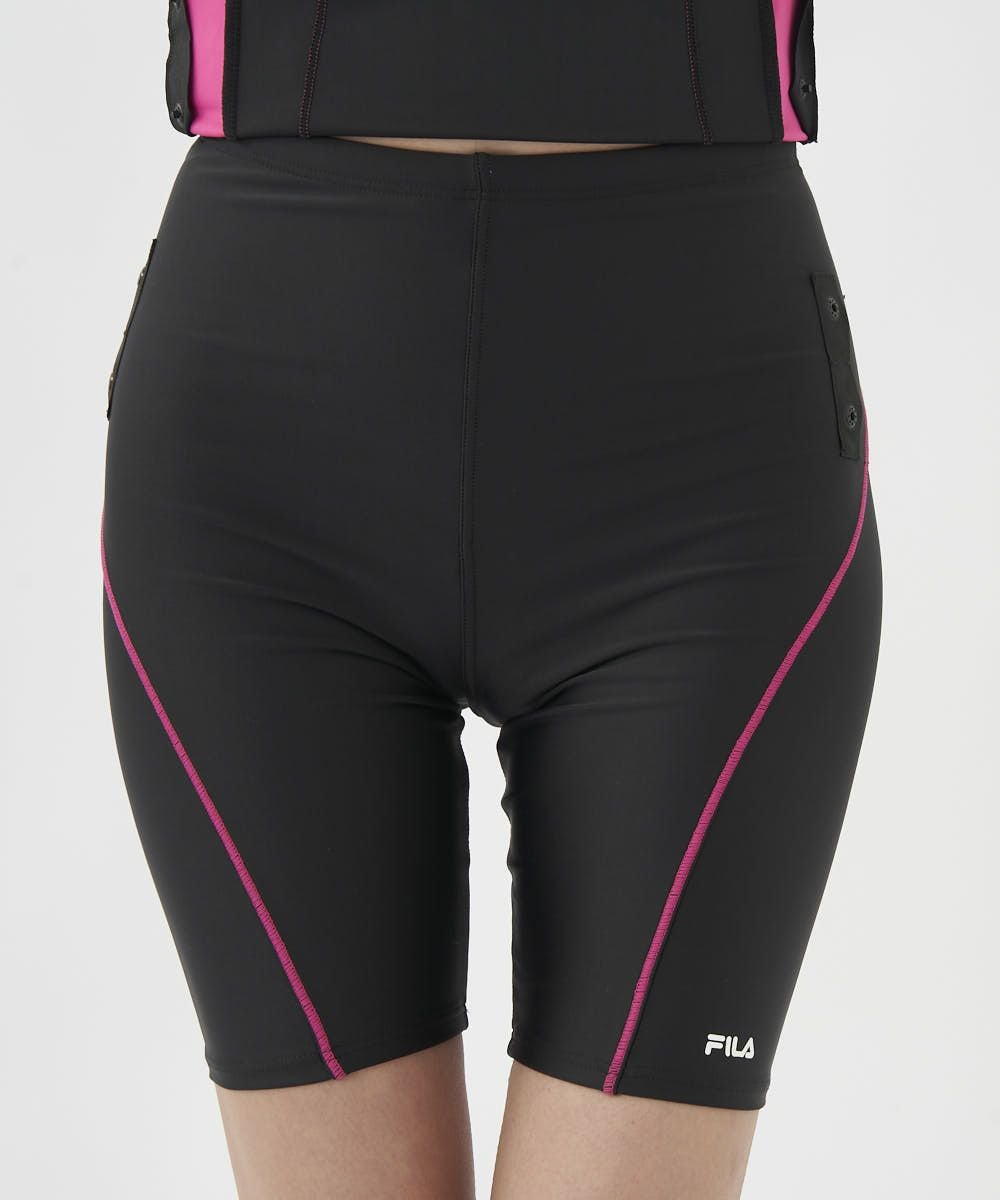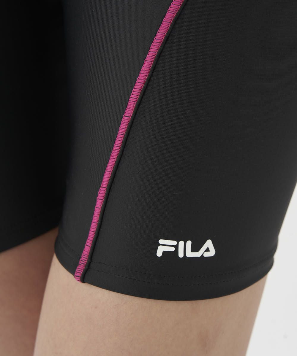 かぶりタンキニ水着。2way方向によく伸びる生地を使用。シンプルなセパレーツ水着。脇切り替えラインが 着痩せ効果有り。カップの取替えができる挿入カップ式。15mmのゴムがアンダー内側に入ってて胸を固定し ててきれいにみせてくれます。体に沿った切り替えとステッチの視覚効果でシャープな脇ライン。ボトムは伸び の良い裏地付。ウエストはスピンドルで調節可能。めくれ防止機能付。FILAロゴプリント入。