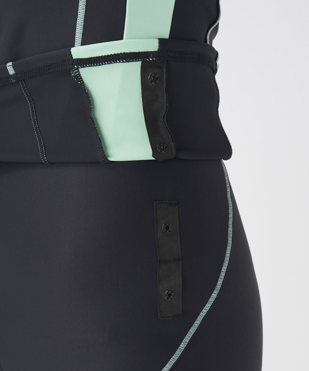 2way方向によく伸びる生地を使用。ファスナー付で着脱が楽なセパレーツ水着。カップの取替えができる挿 入カップ式。アンダー内側の15mmゴムが胸を固定し綺麗に見せます。体に沿った切り替えとステッチの視覚 効果でシャープな脇ライン。クイックジップ機能で楽にファスナーが上がります。ボトム前全面に伸びの良い裏 地付。ウエストはスピンドル入りで調節可能。めくれ防止機能付。FILAロゴプリント入