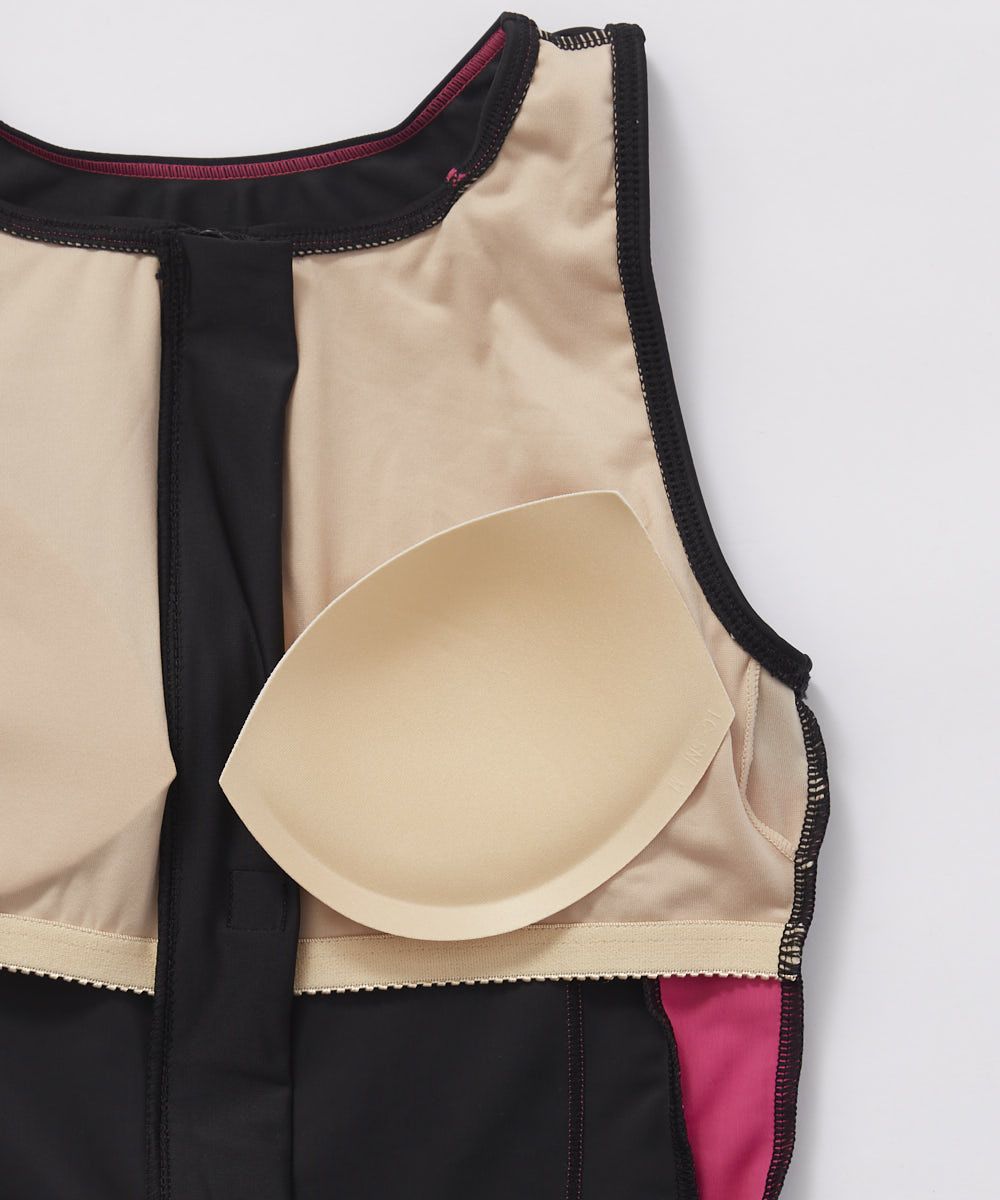 2way方向によく伸びる生地を使用。ファスナー付で着脱が楽なセパレーツ水着。カップの取替えができる挿 入カップ式。アンダー内側の15mmゴムが胸を固定し綺麗に見せます。体に沿った切り替えとステッチの視覚 効果でシャープな脇ライン。クイックジップ機能で楽にファスナーが上がります。ボトム前全面に伸びの良い裏 地付。ウエストはスピンドル入りで調節可能。めくれ防止機能付。FILAロゴプリント入