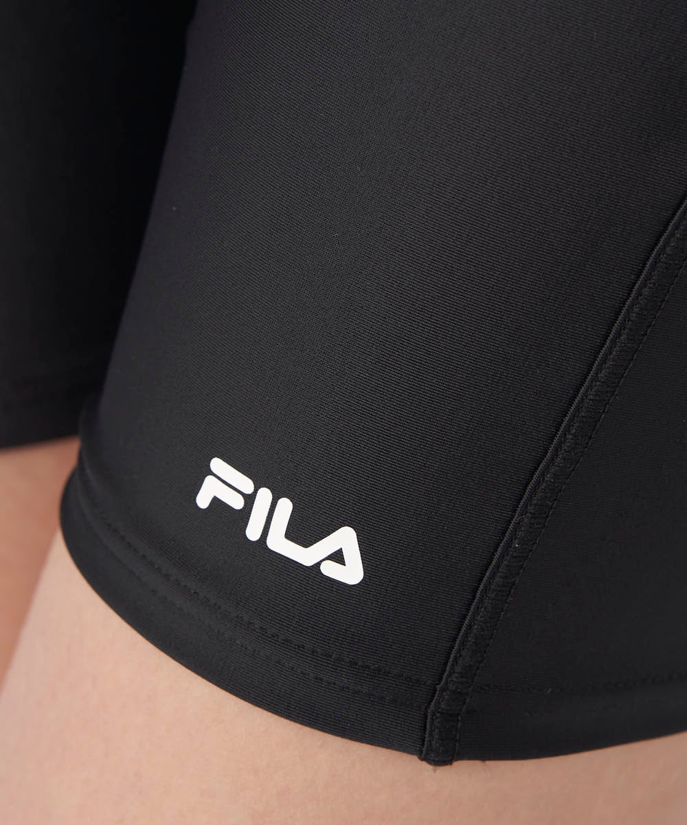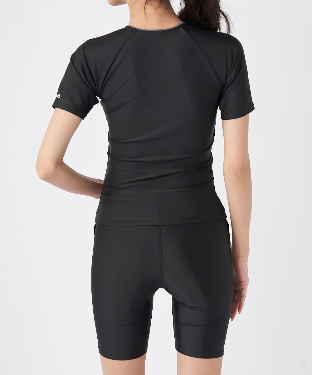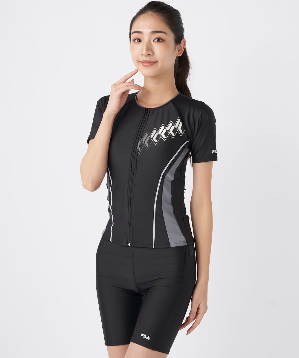 2way方向によく伸びる生地を使用。ファスナー付で着脱が楽なセパレーツ水着。袖付きなので2の腕もカバ ー。カップの取替えができる挿入カップ式。アンダー内側の15mmゴムが胸を固定し綺麗に見せます。Fロゴ グラデーションのアートワークプリント入り。クイックジップ機能で楽にファスナーが上がります。ボトム前全 面に伸びの良い裏地付。ウエストはスピンドル入りで調節可能。めくれ防止機能付。FILAロゴプリント入