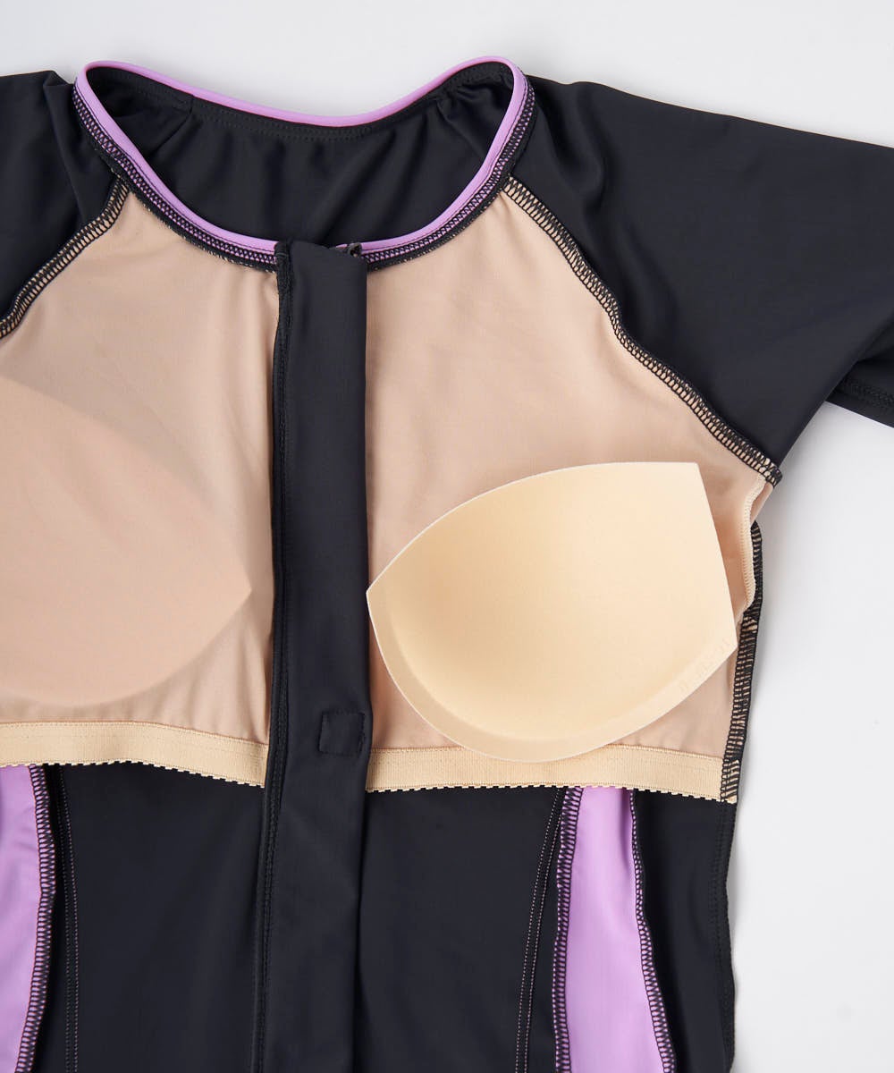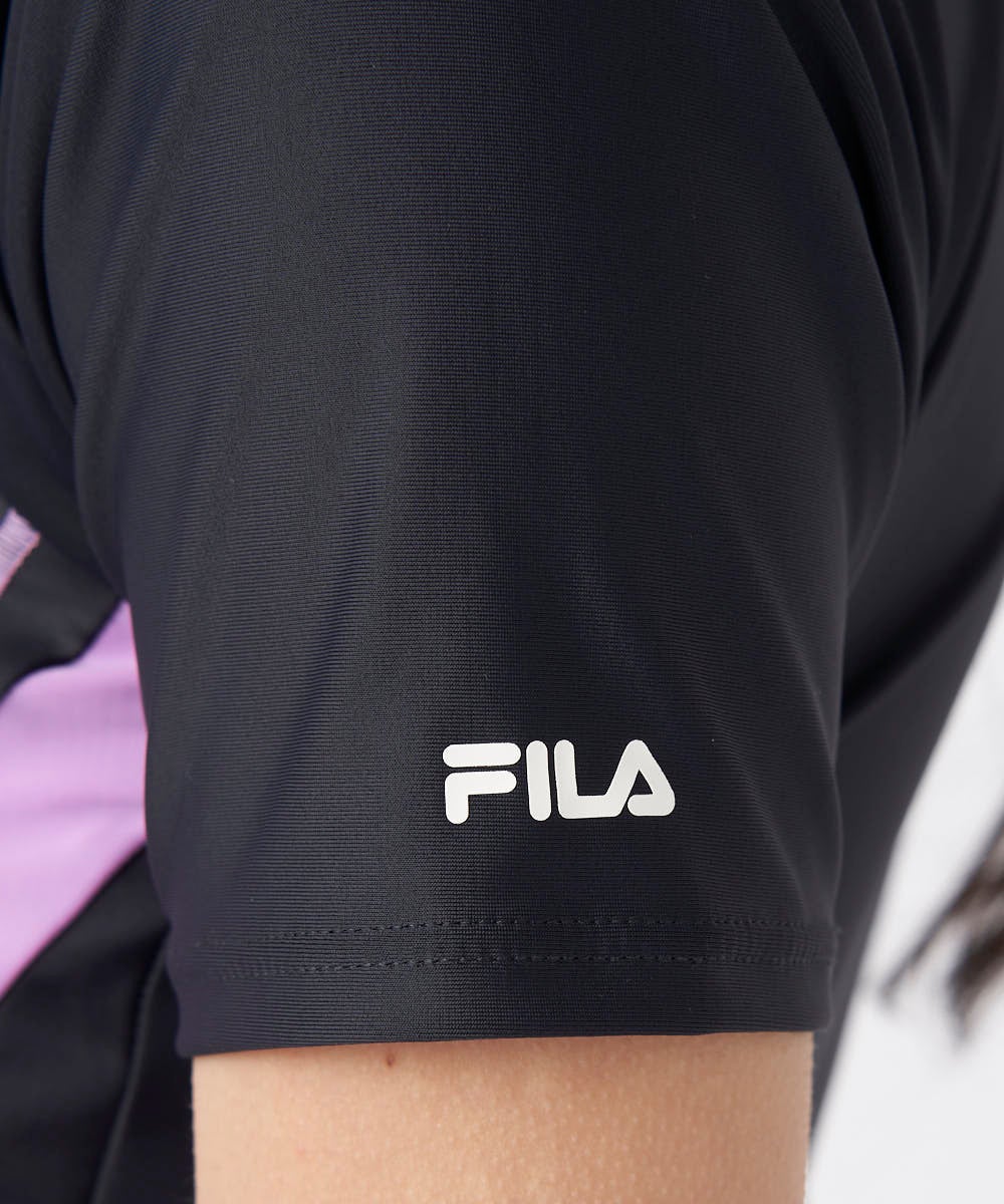 2way方向によく伸びる生地を使用。ファスナー付で着脱が楽なセパレーツ水着。袖付きなので2の腕もカバ ー。カップの取替えができる挿入カップ式。アンダー内側の15mmゴムが胸を固定し綺麗に見せます。Fロゴ グラデーションのアートワークプリント入り。クイックジップ機能で楽にファスナーが上がります。ボトム前全 面に伸びの良い裏地付。ウエストはスピンドル入りで調節可能。めくれ防止機能付。FILAロゴプリント入