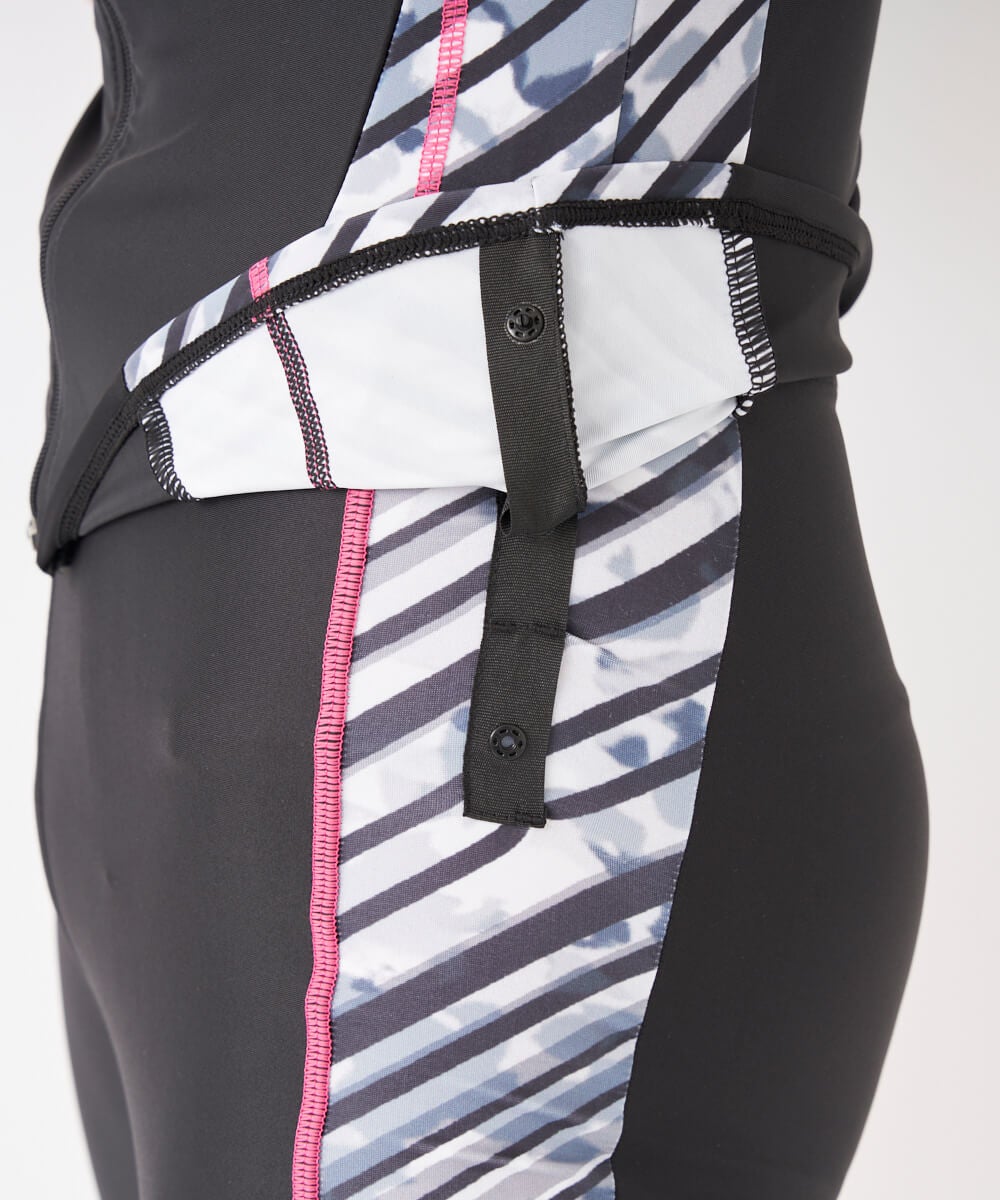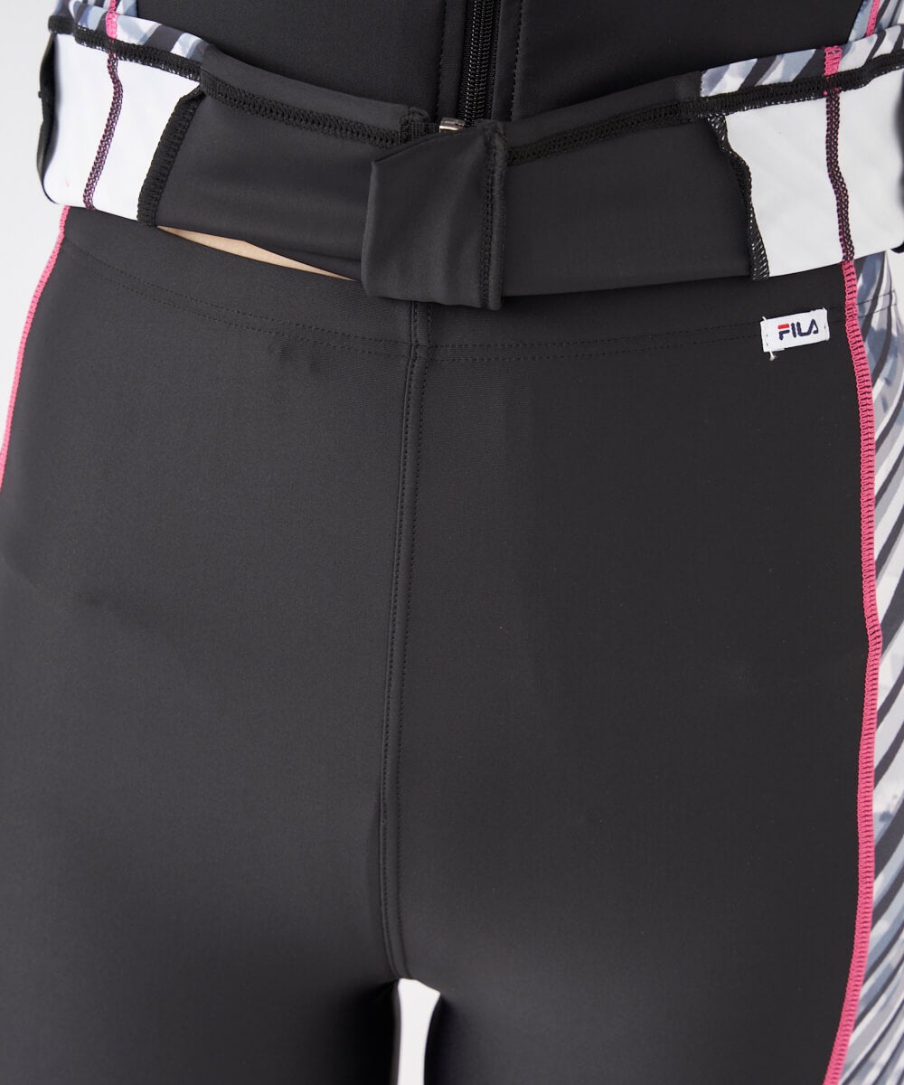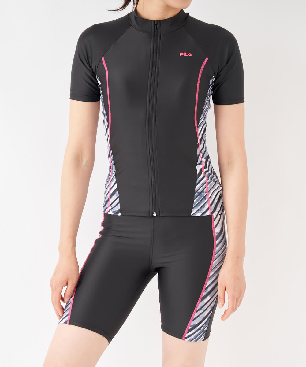 2way方向によく伸びる生地を使用。トップスはファスナー付で着脱が楽な袖付セパレーツ水着。カップは挿 入カップ式。アンダー内側の15mmゴムが胸を固定し綺麗に見せます。バイアスボーダープリントの切り替え が脇に入ったデザイン。クイックジップ機能で楽にファスナーが上がります。ボトム前全面に伸びの良い裏地付 。ウエストはスピンドル入りで調節可能。めくれ防止機能付。FILAロゴ刺繍入