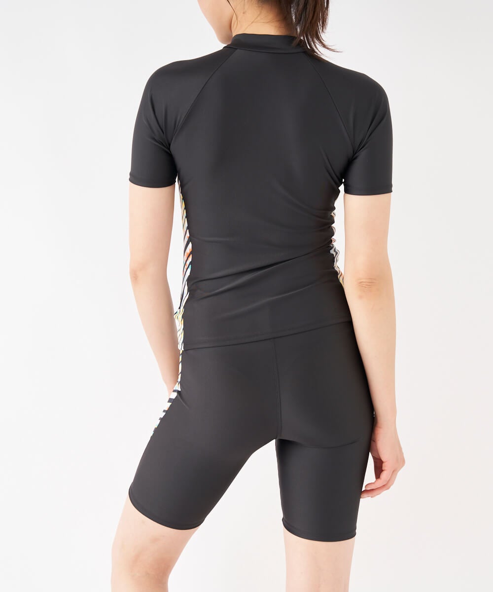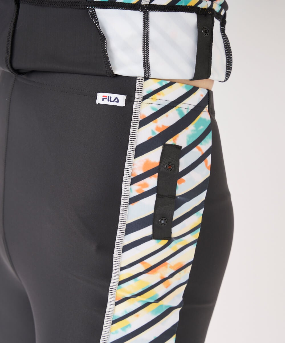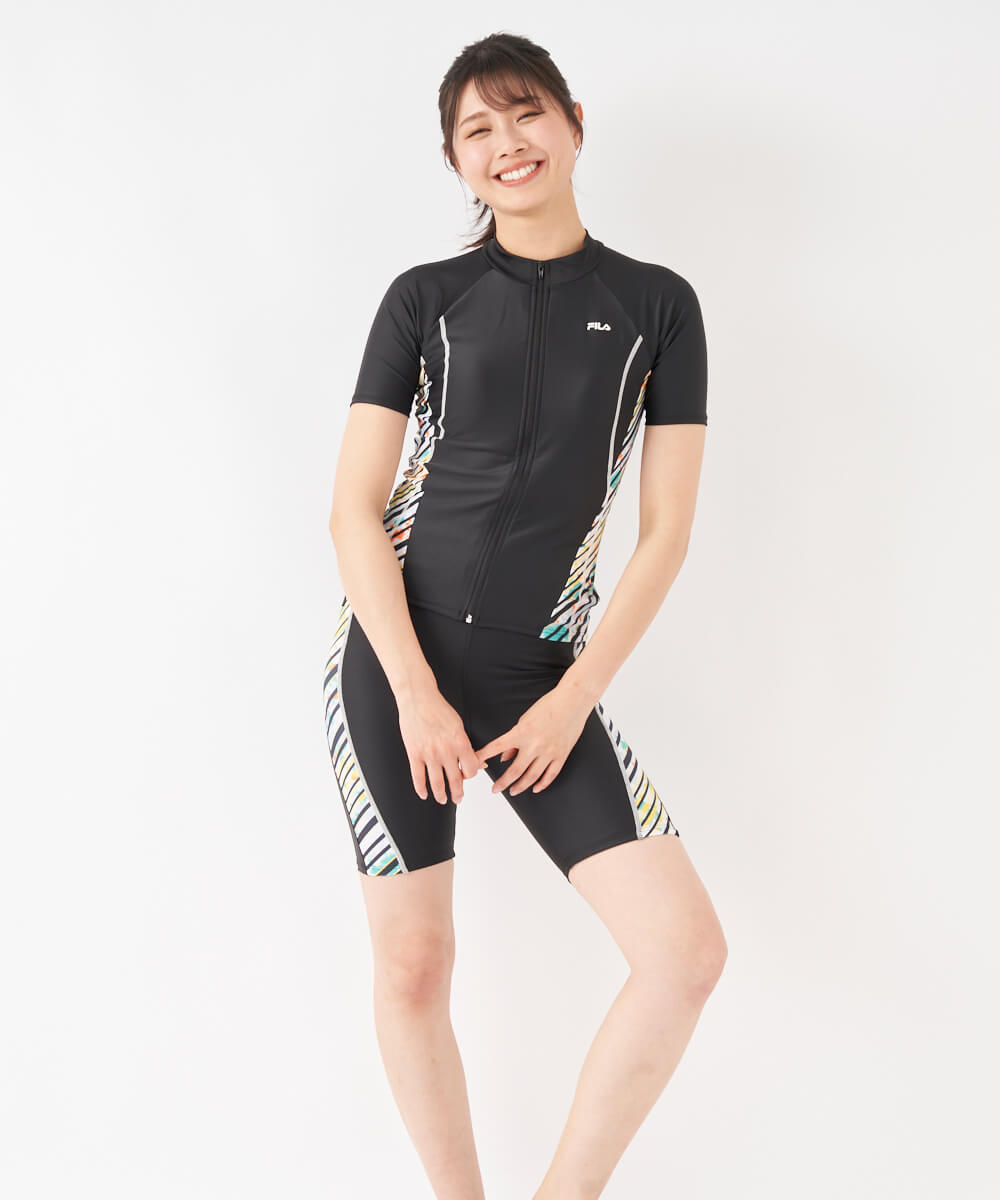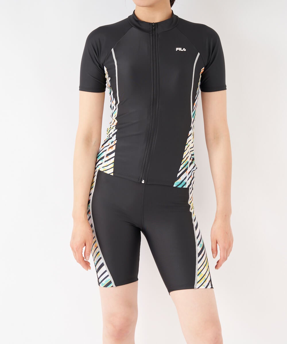 2way方向によく伸びる生地を使用。トップスはファスナー付で着脱が楽な袖付セパレーツ水着。カップは挿 入カップ式。アンダー内側の15mmゴムが胸を固定し綺麗に見せます。バイアスボーダープリントの切り替え が脇に入ったデザイン。クイックジップ機能で楽にファスナーが上がります。ボトム前全面に伸びの良い裏地付 。ウエストはスピンドル入りで調節可能。めくれ防止機能付。FILAロゴ刺繍入