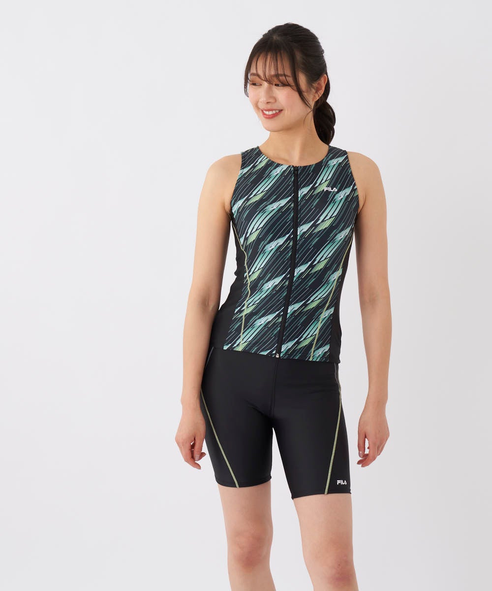 バイヤス幾何柄のプリントがスポーティーなトップス。体に沿った切替ラインが視覚効果でシャープに見えるデ ザイン水着です。パンツのステッチで足を綺麗に見せる効果があります。ファスナーが上げやすいクイックジッ プ機能、TOPSの裾がめくれないようにめくれ防止機能付。カップは入れ替えできる差し込みタイプです。