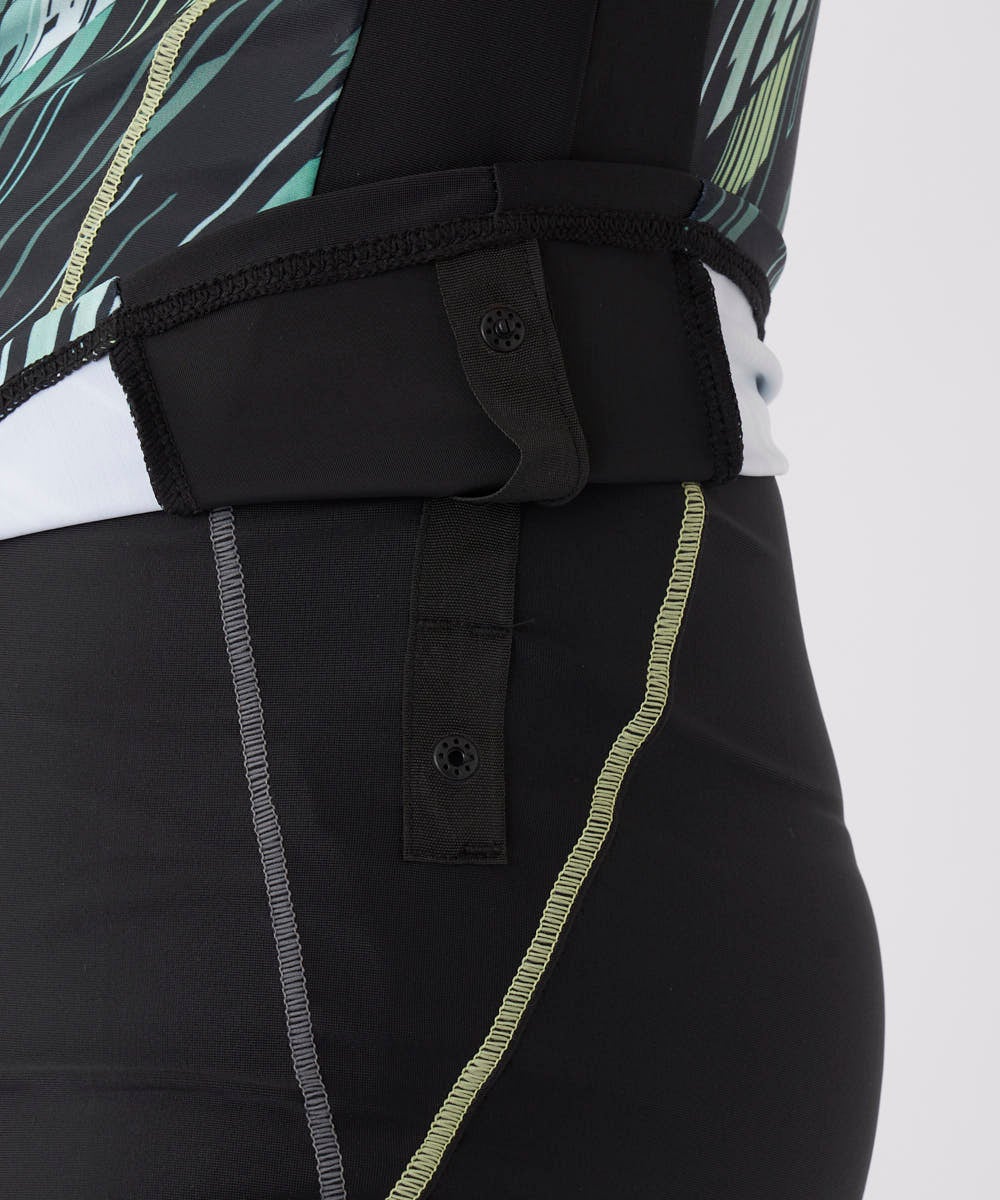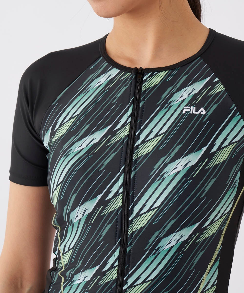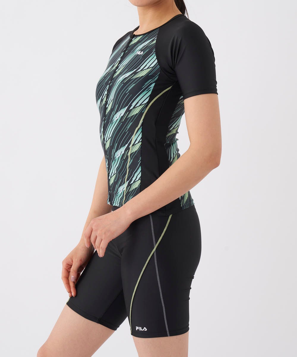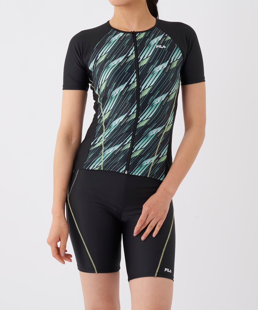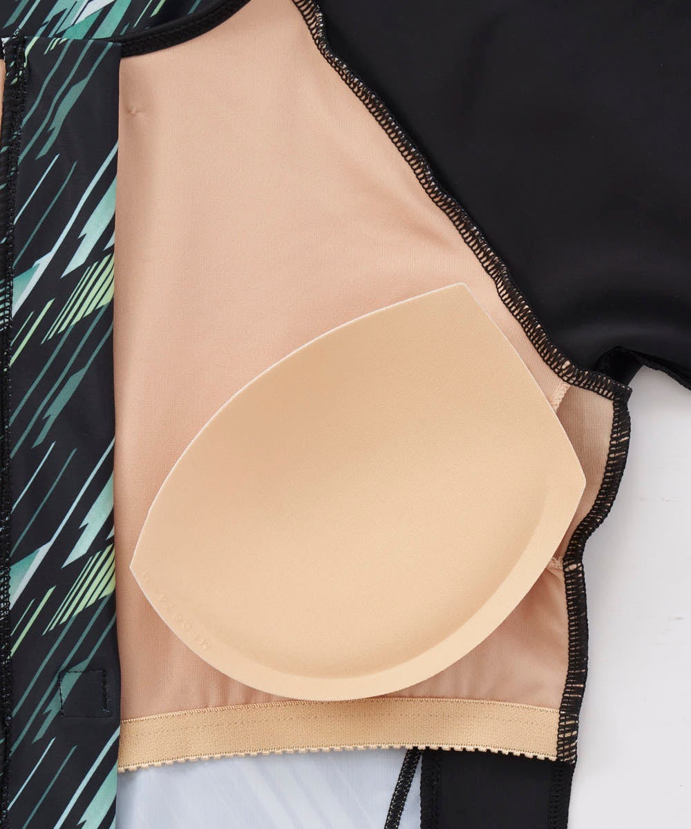 バイヤス幾何柄プリントがスポーティーな半袖のトップス。二の腕がカバーできる半袖セパレーツ水着。脇の切 替でウエストがシェイプして見える視覚効果を。ファスナーが上げやすいクイックジップ機能、TOPSの裾が めくれないようにめくれ防止機能付。カップは入れ替えできる差し込みタイプです。