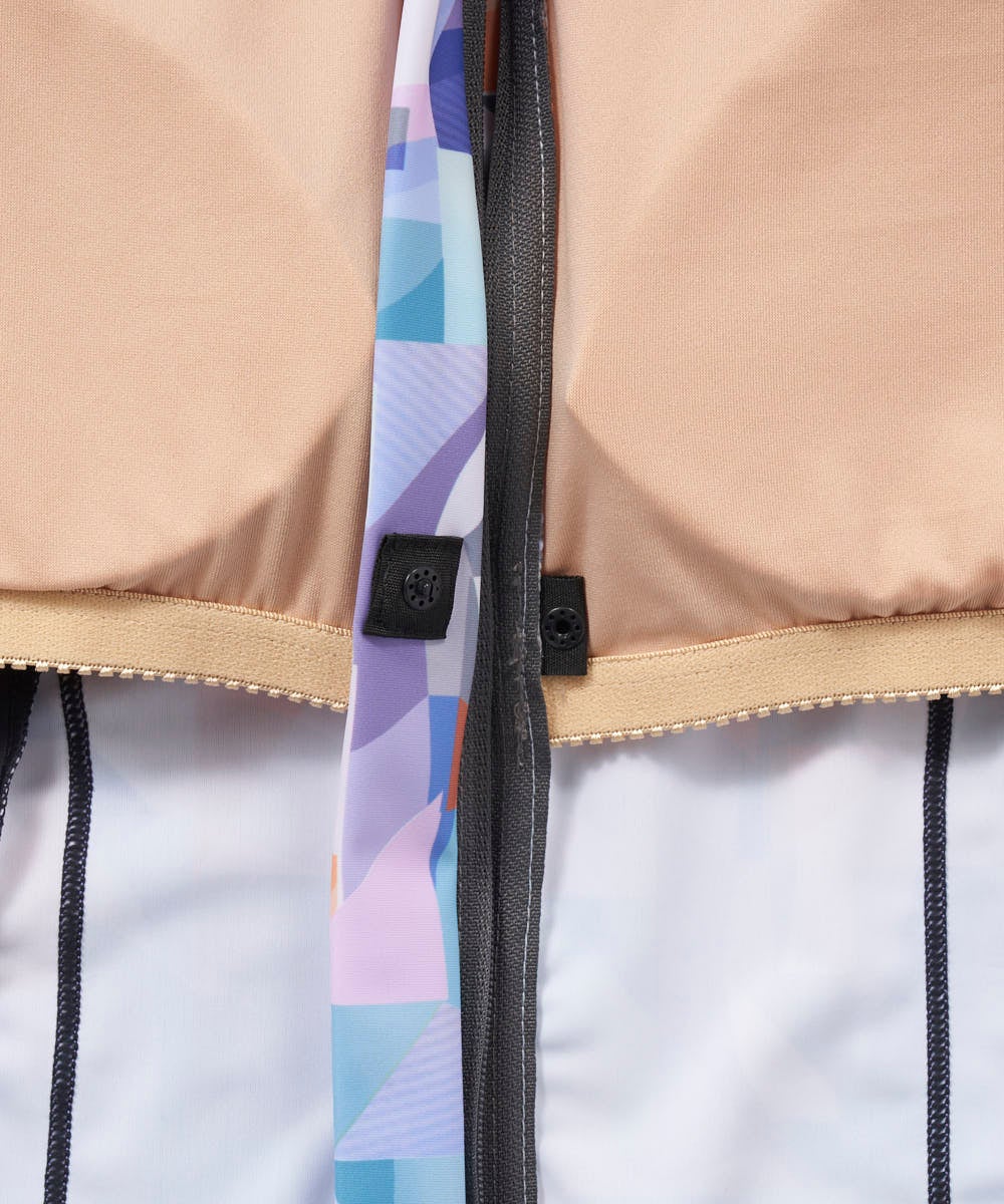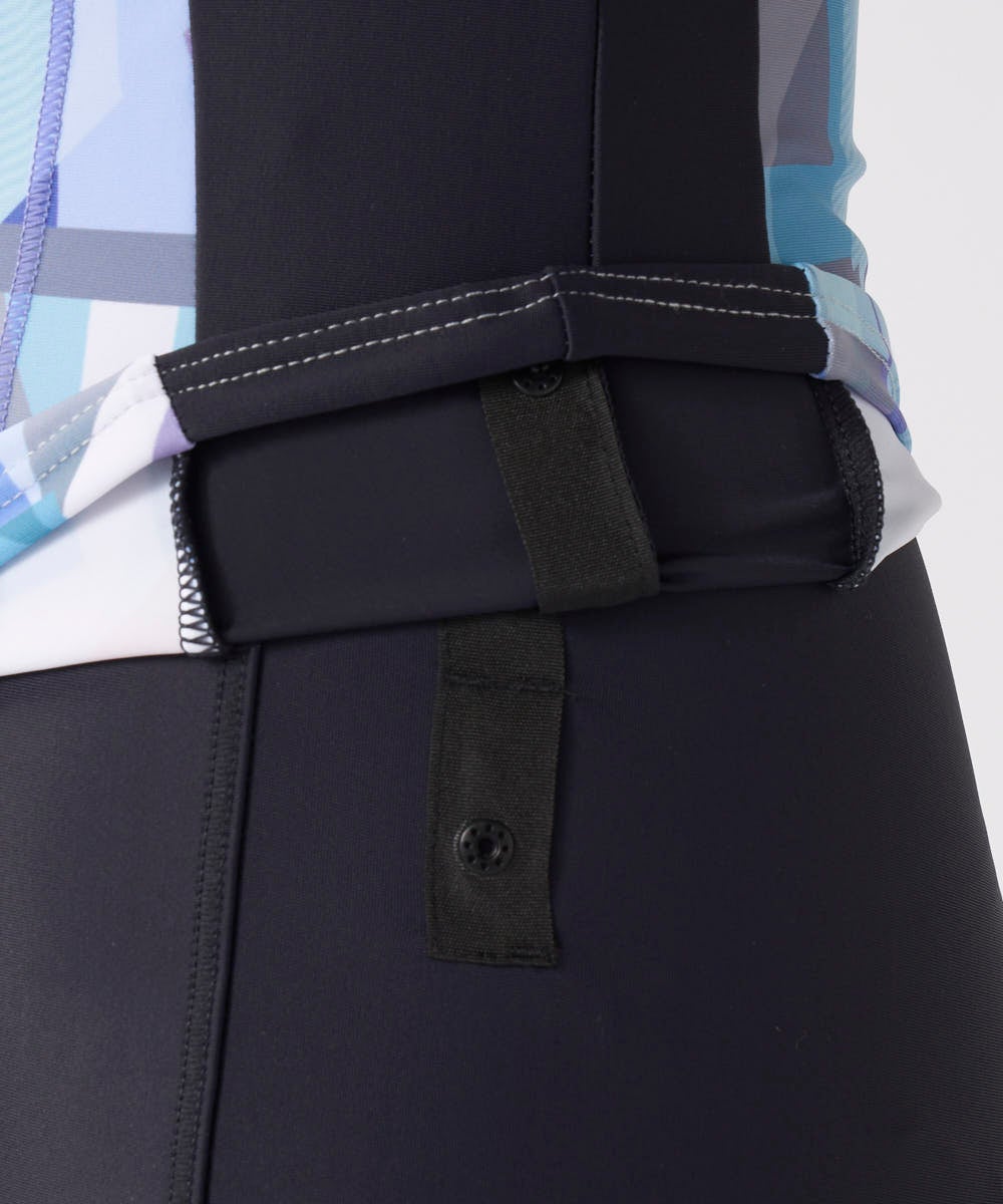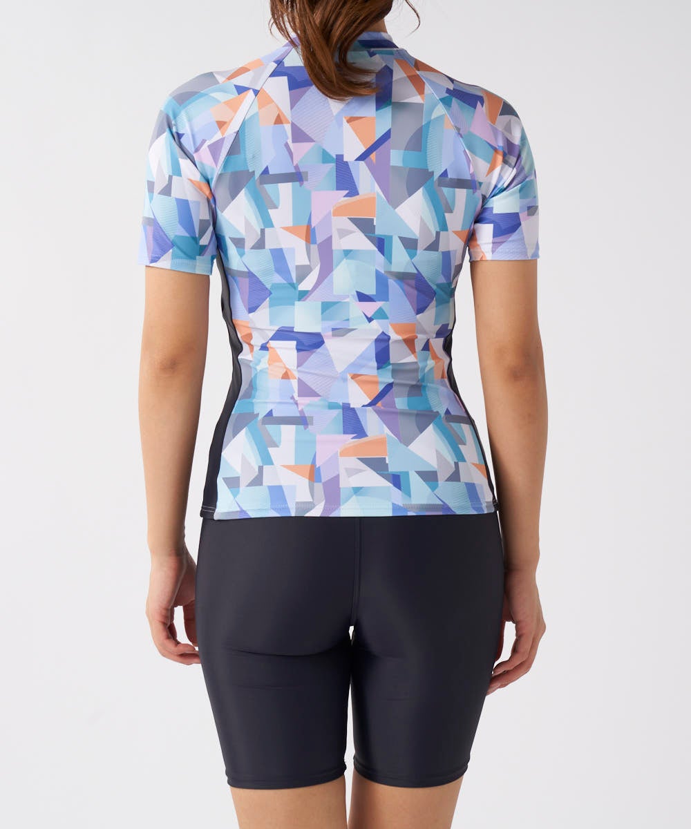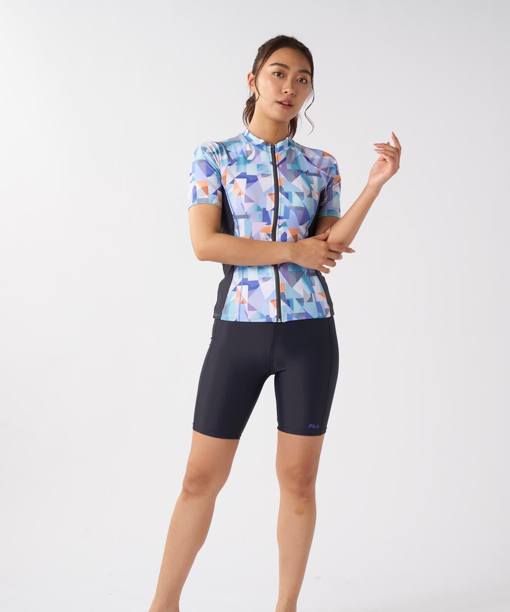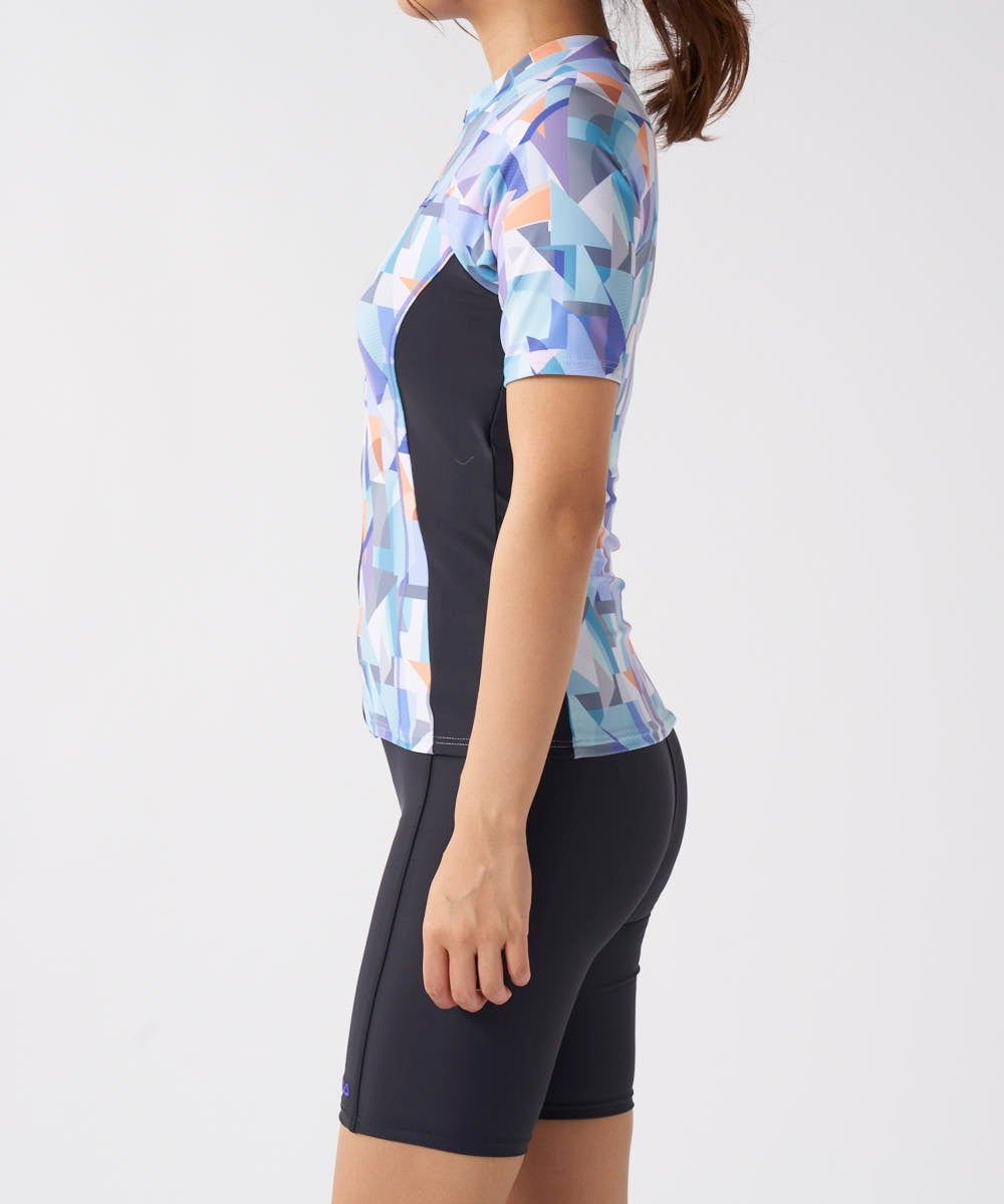 ソフトなカラーブロックプリントでオシャレな半袖トップス、ハイネックのセパレーツ水着。脇の切替がウエス トをシャープに見せてくれます。ファスナーが上げやすいクイックジップ機能、TOPSの裾がめくれないよう にめくれ防止機能付。カップは入れ替えできる差し込みタイプです。