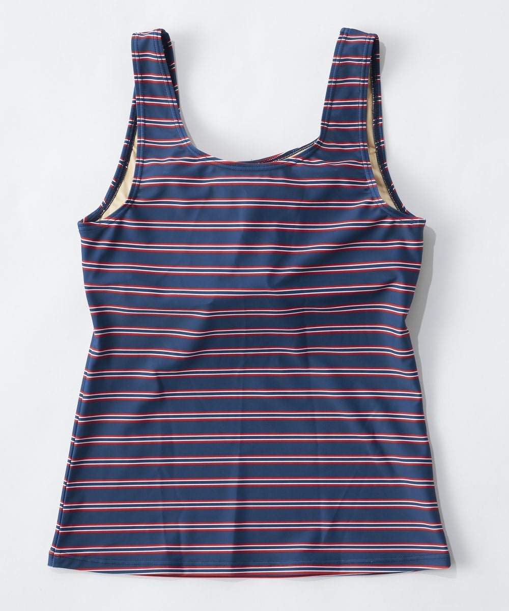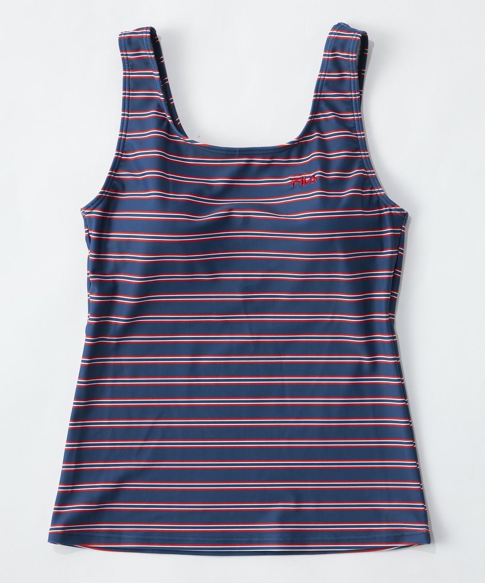 Tシャツ+タンキニ+ビキニパンツ+スウェット生地パンツの4点セット 胸元のFILAロゴがカラフルでイ ンパクトを与えています。ラグラン袖で色変えすることでスポーティーカジュアルに。タンキニ水着もボーダー なのでTシャツを脱いでもオシャレな感じです。海やプールでも使用できる便利なセット水着です。