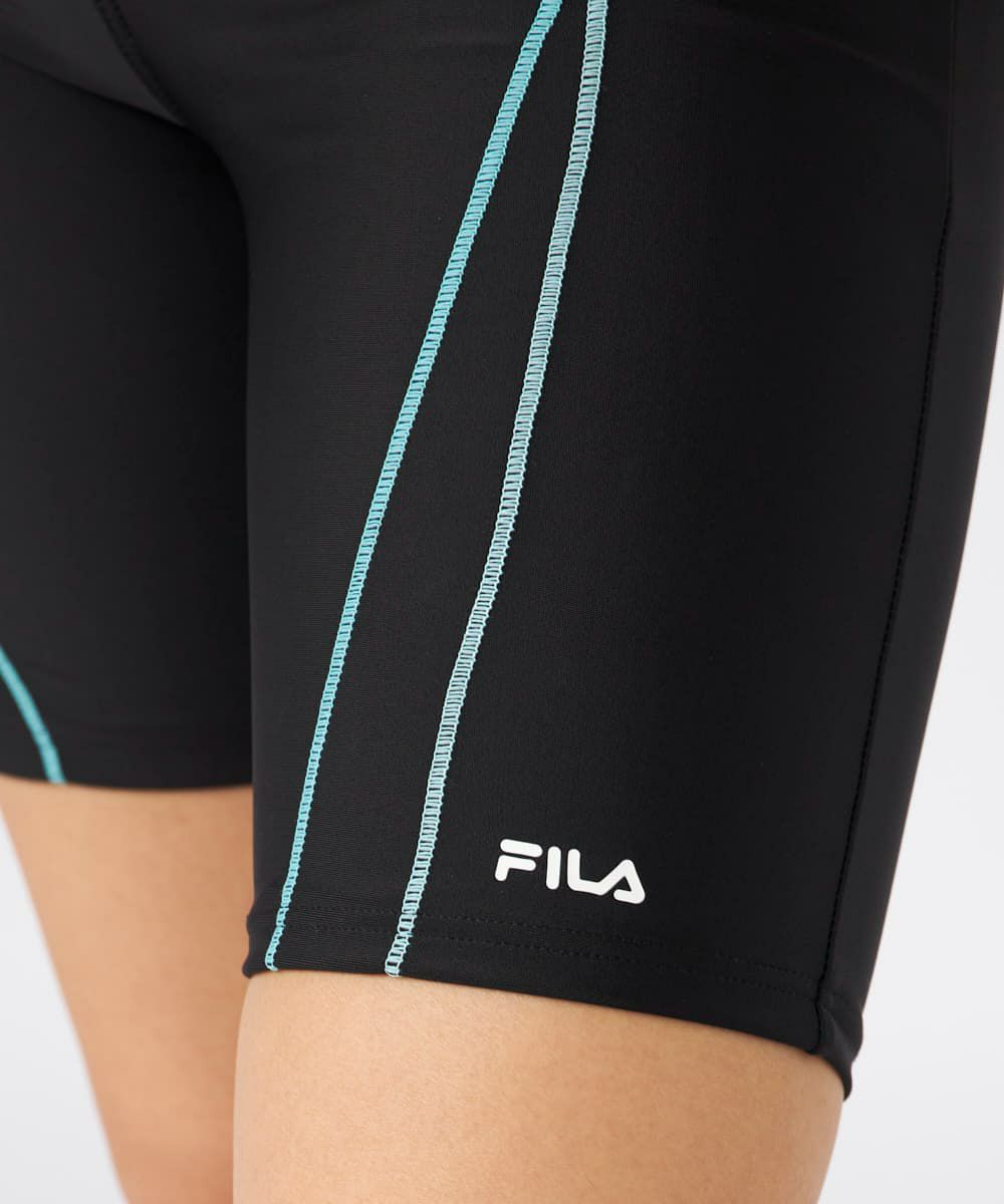 FILAセパレートフィットネス水着。スナップボタンタイプのめくれ防止機能付き。前ファスナーで着 脱楽々サイドはカラー配色で細見せ効果があり胸にFILAのロゴプリントのデザイン。半袖タイプなの で気になる二の腕もカバーできます。胸裏部分は挿入式のカップが付いていてお好きなカップに入れ 替えも可能です。パンツ前部分全体にも胸部分と同じ伸びの良い裏地をつけています。ウエストは内 側の紐で調節できます。