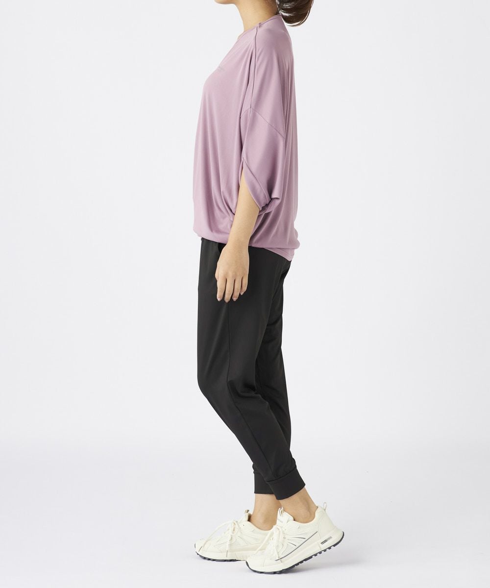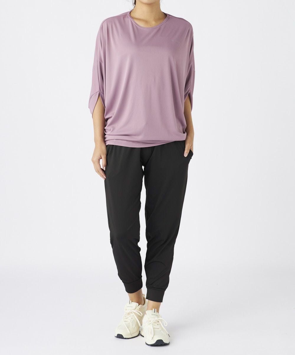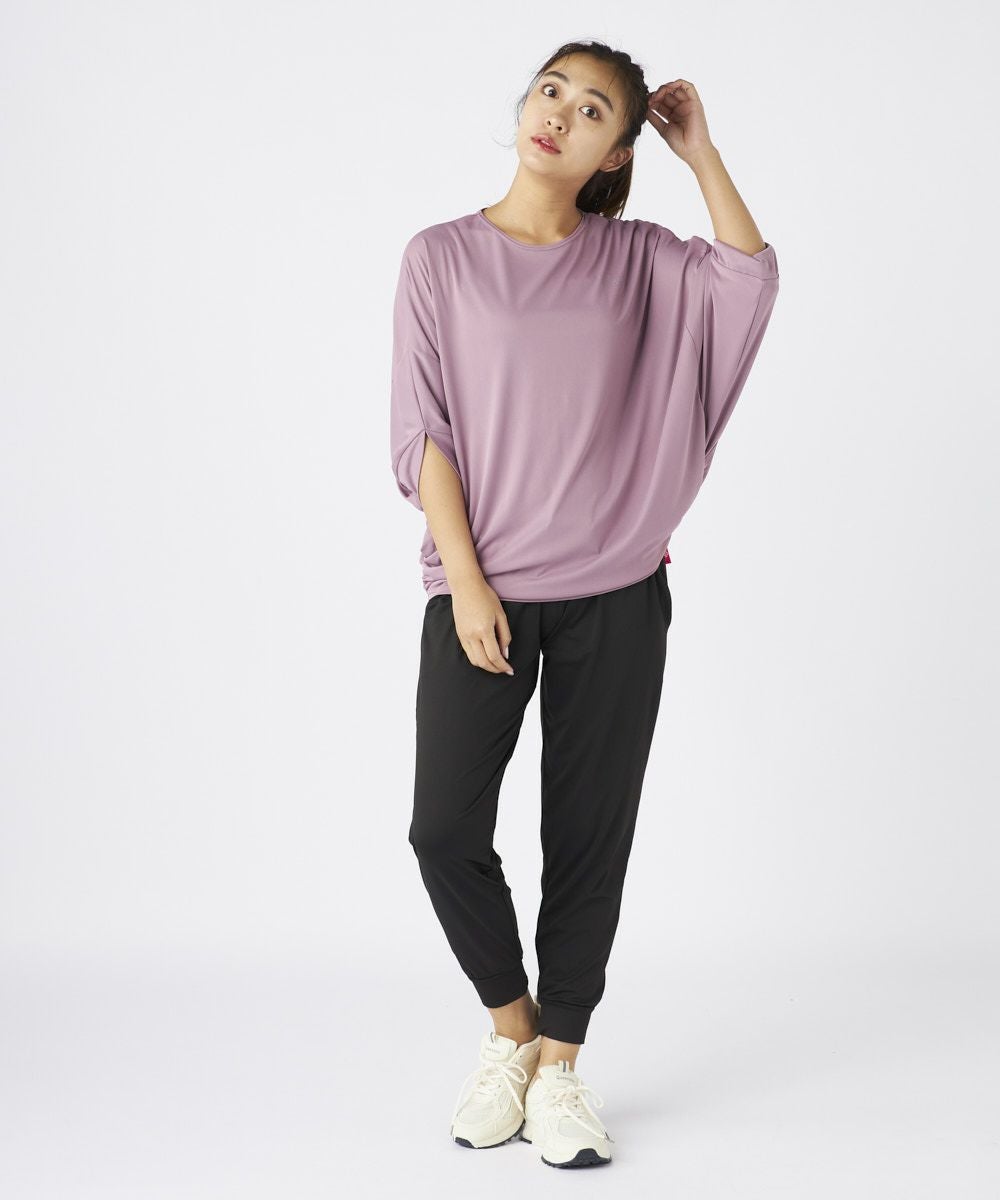 ドルマンスリーブのドレープ感が大人な女性を演出するおしゃれなフィットネスウェアセットアップ 。トップスは丈が長めでヒップをカバーできるので安心。ボトムにインして着てもかわいい袖が長め で二の腕もしっかりカバー。ボトムは緩めで動きやすく足先はゴム仕様でずれにくくこのセットがあ ればちょっとしたウォーキングからホットヨガやピラティスなどのスポーツまで着用可能で楽な着心 地のでホームウェアにもオススメです。