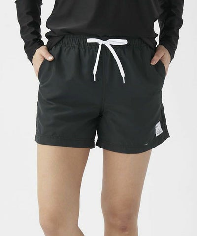 シンプルなブラックカラーで、ビーチやプール、タウンユースにも使える万能アイテムです。軽量なポリエステル素材で速乾性があり、ウエストはゴムとドローコードで調整可能。シンプルなデザインで、どんなトップスとも相性抜群。